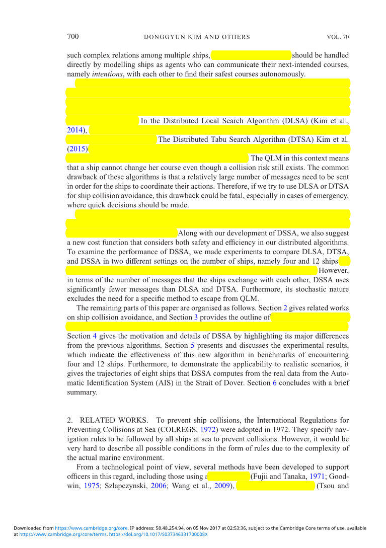 Hornauer(2013)和Hornauer et al.(2015)提出了一种分散的轨道优化算法,以避免在部分合作的船舶之间发生碰撞。非合作船舶的运动是由使用AIS数据的贝叶斯模型计算的。利用历史概率模型预测被动船舶的估计位置的概率是精确计算的。当三艘船相遇时,计算轨迹是合理的。然而,在这些文件中没有提供任何新的合作船只的显式算法。