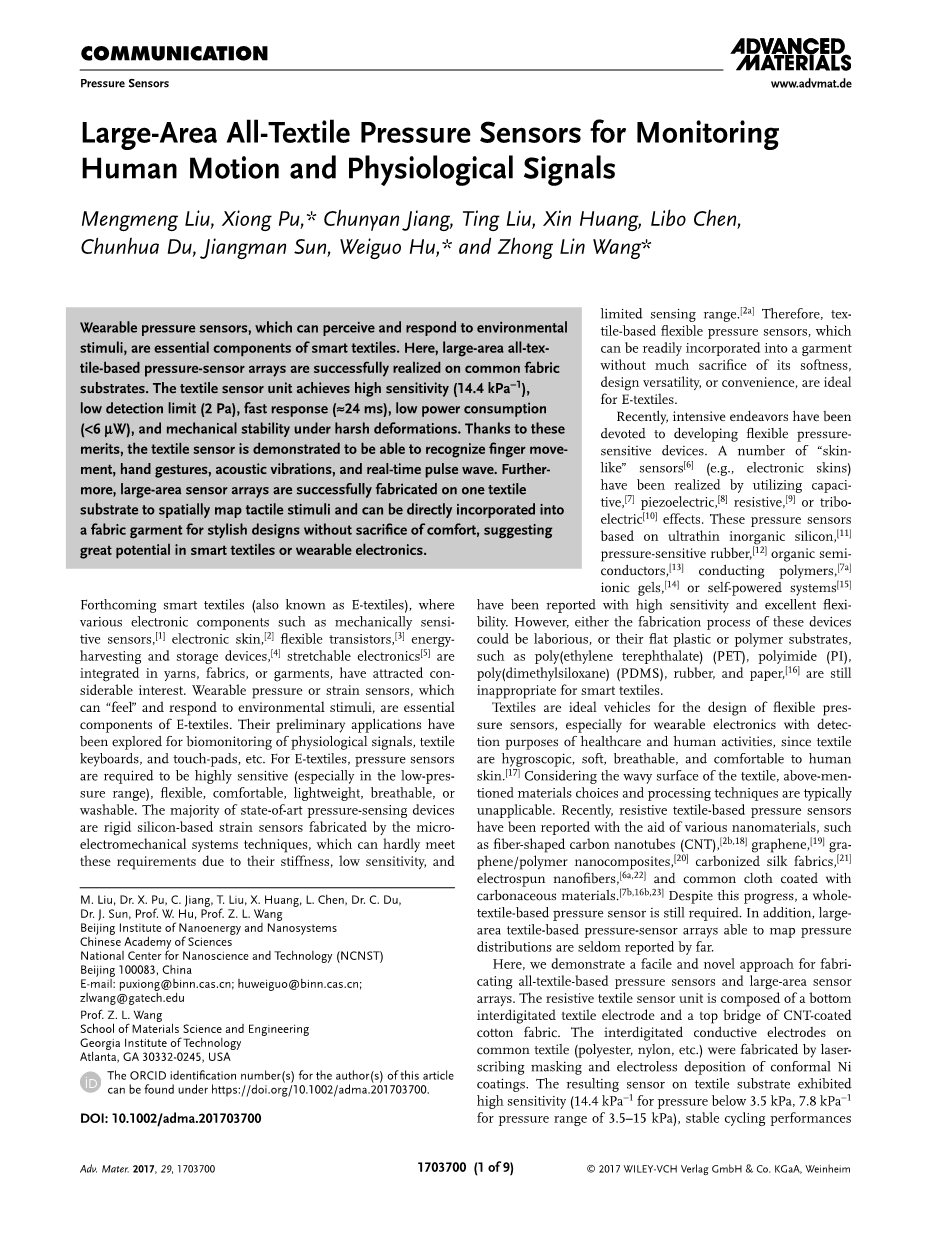 由于纺织品具有吸湿,柔软,透气和对于人体皮肤舒适的特性,纺织品是设计柔性压力传感器的理想工具,特别是对于具有医疗保健和人类活动检测目的的可穿戴电子设备而言。[17] 考虑到纺织品的波浪表面,上述材料选择和加工技术通常是不适用的。近来,基于电阻纺织物的压力传感器已经在各种纳米材料的帮助下出现,例如纤维状碳纳米管(CNT),[2b,18]石墨烯,[19]石墨烯/聚合物纳米复合材料,[20]碳化丝织物 ,[21]静电纺纳米纤维,[6a,22]和涂有含碳材料的普通布。[7b,16b,23]尽管取得了这些进展,仍然需要基于全织物的压力传感器。 此外,能够绘制压力分布的大面积纺织压力传感器阵列很少有报道。