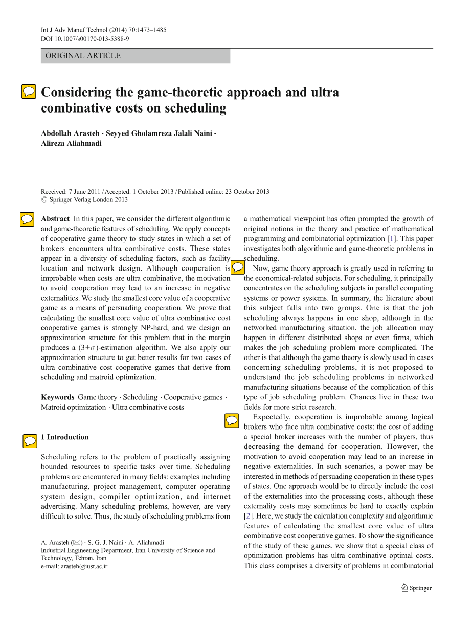 在本文中,我们考虑了调度的不同算法和博弈理论特征。我们运用合作博弈理论的概念来研究一组经纪人遇到超组合成本的状态。这些情况出现在调度因素的多样性中,比如设备位置和网络设计。虽然当成本是超组合的时候合作是不可能的,避免合作可能会导致负外部性的增加。我们研究合作游戏的最小核心价值,作为说服合作的手段。我们证明了计算最小超组合成本合作游戏的核心价值是一个困难的np难题,我们为这个问题设计一个近似结构,产生一个幅度(3 sigma;)估计算法。我们也应用我们的近似结构,得到了两种基于调度和矩阵优化的超组合成本合作博弈的结果。