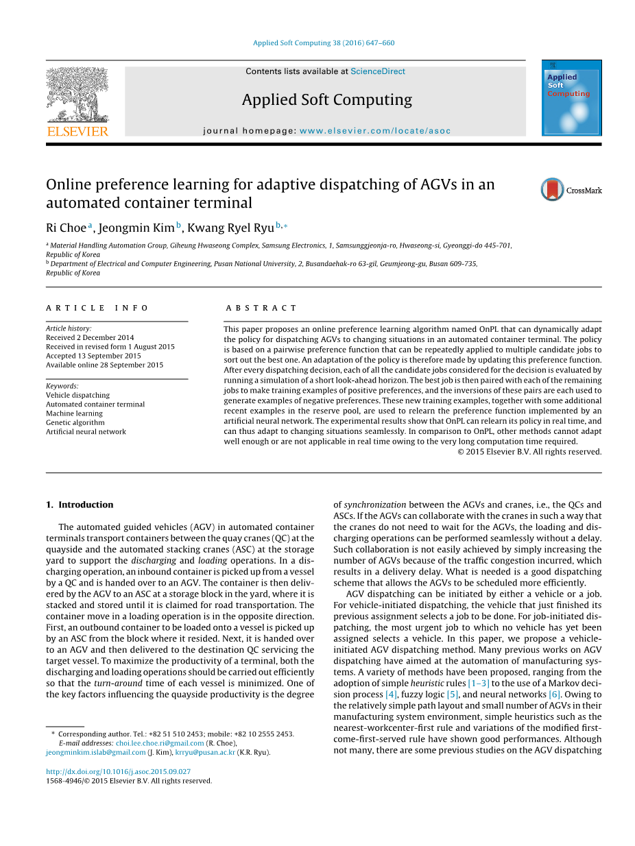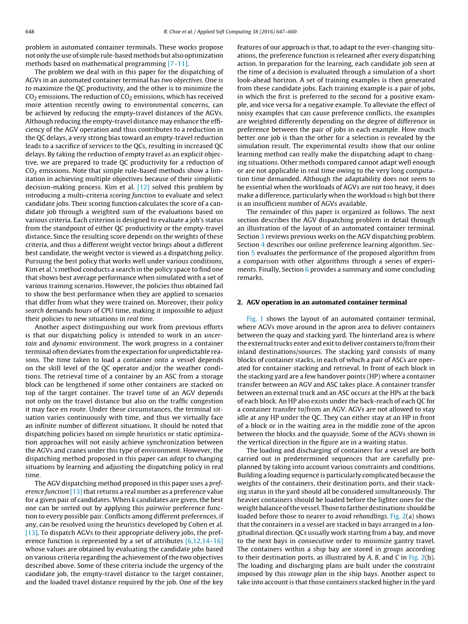 我们在本文中讨论的调度问题自动化集装箱码头中的AGV有两个目标。一个是以最大限度地提高QC生产力,另一个就是最小化排放量。减少了二氧化碳的排放量最近由于环境问题更多的关注可以通过减少AGV的空行程距离来实现。虽然减小空行程可能会提高效率,AGV操作的效率,从而有助于减少质量控制延迟,对空行程减少非常强烈导致对QC的服务牺牲,从而导致QC的增加延迟。通过将空行程减少作为一个明确的目标,我们准备交换QC生产力以减少排放量。请注意,简单的基于规则的方法由于其简单性而在实现多个目标方面表现出一种限制做决定的过程。Kim等人通过解决这个问题引入多标准评分函数来评估和选择候选人工作。他们的评分函数通过基于评估的加权总和来计算可以完成任务的分数各种标准。每个标准都旨在评估工作状态从QC生产率或空行程的角度来看距离。由于得到的分数取决于这些的权重标准,因此不同的权重向量带来不同最佳候选者,权重向量被视为调度策略。追求在各种条件下运作良好的最佳政策,Kim等人的方法在政策空间中进行搜索以找到一个当使用一组模拟进行模拟时,它显示出最佳平均性能各种训练场景。但是,由此获得的政策失败了以在应用于场景时显示最佳性能这与他们接受的培训不同。此外,他们的政策搜索需要数小时的CPU时间,使其无法调整他们的政策实时适应新情况。将我们的工作与以前的工作区分开来的另一个方面是,我们的调度策略旨在在不确定和动态的环境中工作。集装箱码头的工作进度往往偏离对不可预测的理由的期望。将容器装载到船上所用的时间取决于QC操作员的技能水平和/或天气条件。如果其他容器堆叠在目标容器的顶部,ASC从容器中取出容器的时间可以延长。 AGV的旅行时间不仅取决于行驶距离,还取决于它可能面临的交通堵塞。在这种情况下,终端的定位随着时间而不断变化,因此我们实际上面临着无数种不同的情况。应当指出的是基于简单启发式或静态优化方法的调度策略在这种类型的环境下不会轻易实现AGV和起重机之间的同步。然而,本文提出的调度方法能够通过实时学习和调整调度策略来适应变化的情况。本文提出的AGV调度方法使用一个优先函数,它返回一个实数作为优先值对于给定的一对候选人。当给予k个候选人时,最好可以通过将这种成对的偏好函数应用于每个可能的对来对其进行排序。如果不同的偏好有冲突任何,都可以使用Cohen等人开发的启发式方法来解决。为了将AGV分派到其适当的交付工作中,优先功能由一组属性表示其价值是通过评估基于候选职位而获得的关于实现这两个目标的各种标准如上所述。其中一些标准包括紧急情况候选作业,到目标容器的空行程距离,以及作业所需的加载行程距离。我们的方法的关键特征之一是,为了适应不断变化的现场情况,偏好功能在每次调度之后被重新学习行动。在准备学习的过程中,每个候选人的工作都被看到了通过短期模拟来评估决策的时间超前视界。然后生成一组训练实例从这些候选人的工作。每个培训示例都是一对工作,其中第一个比第二个更适合积极考试,反之亦然。减轻效果嘈杂的例子,可能会导致偏好冲突,例子根据不同的程度,权重会有所不同每个示例中的一对作业之间的偏好。多少更好的一项工作比另一项工作更好仿真结果。实验结果表明我们的在线学习方法可以真正使调度适应变化的情况。其他方法比较不能很好地适应或者由于需要非常长的计算时间而不能实时应用。虽然似乎不适应当AGV的工作量不是太重时,它是必不可少的有所作为,特别是在工作量很高的情况下时可用的AGV数量不足。