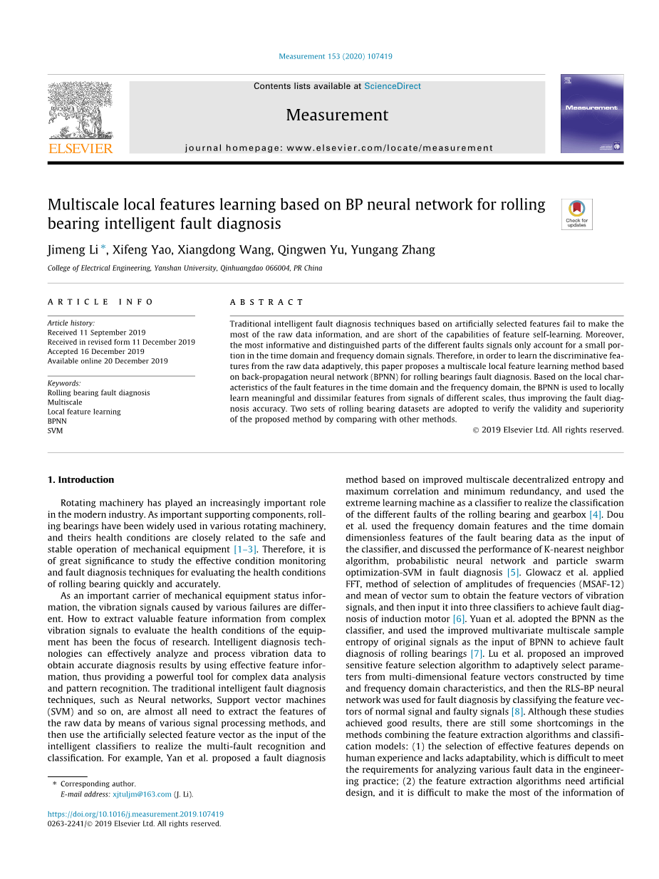 基于BP神经网络的多尺度局部特征学习用于滚动轴承智能故障诊断