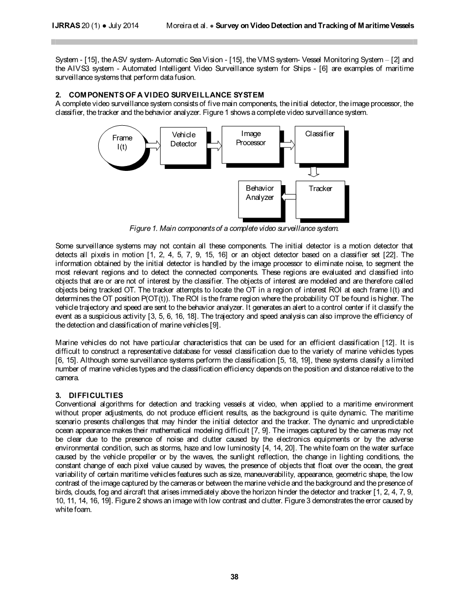 有些监视系统可能不包含所有这些组件。初始检测器是检测所有运动像素的运动检测器[1、2、4、5、7、9、15、16]或基于分类器集的对象检测器[22]。图像处理器处理由初始检测器获得的信息以消除噪声、分割最相关的区域和检测连接的组件。这些区域被评估并被分类为分类器感兴趣或不感兴趣的对象。感兴趣的对象被建模,因此称为被跟踪的对象。跟踪器尝试在每帧I(t)处的感兴趣区域中定位OT,并确定OT位置P(OT(t))。ROI是一个帧区域,在这个帧区域中不被发现的概率更高。将车辆轨迹和速度发送到行为分析器。如果将事件归类为可疑活动,它会向控制中心发出警报[3、5、6、16、18]。弹道和速度分析也可以提高对舰船的探测和分类效率[9]。
