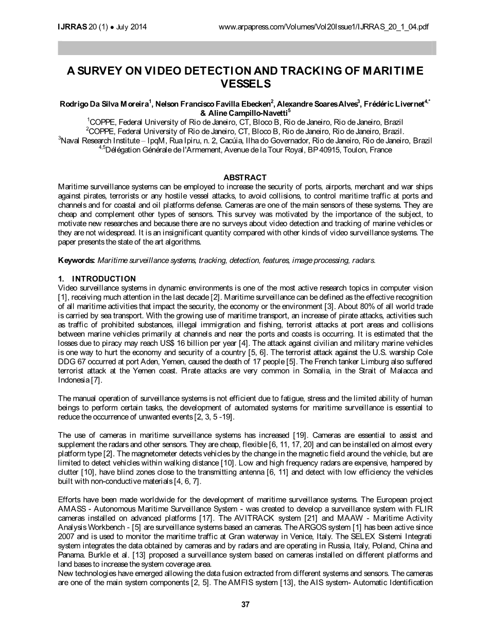 海上监视系统可用于加强港口、机场、商船和战船的安全,防止海盗、恐怖分子或任何敌对船只袭击,避免碰撞,控制港口和航道的海上交通,以及海岸和石油平台的防御。摄像机是这些系统的主要传感器之一。它们价格便宜,可以补充其他类型的传感器。这项调查的动机是该课题的重要性,以推动新的研究,因为没有关于海洋车辆的视频检测和跟踪的调查,或者这些调查并不广泛。与其他类型的视频监控系统相比,这是一个微不足道的数量。本文介绍了最新的算法。