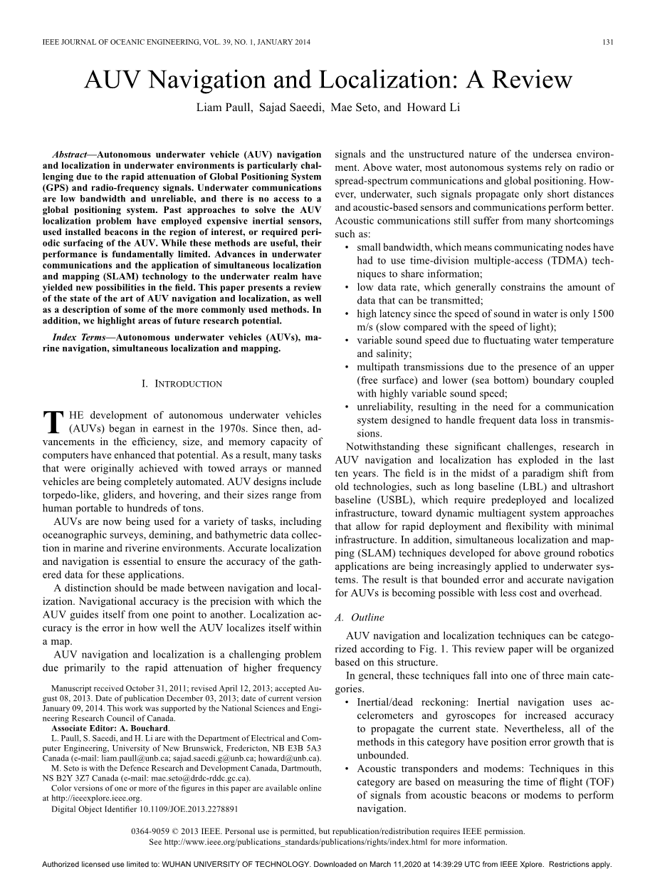 过去对此主题的评论包括[1] – [3]。自从这些评论以来,无论是在以前建立的技术还是在新领域,都取得了重大进展。特别地,通过使用水下调制解调器的声学通信的发展导致了新算法的发展。此外,SLAM研究的进展已通过许多新方法应用于水下领域。