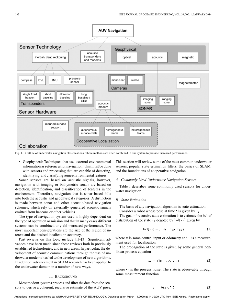 本节将回顾一些最常见的水下传感器,流行的状态估计滤波器,SLAM的基础知识以及协作导航的基础。