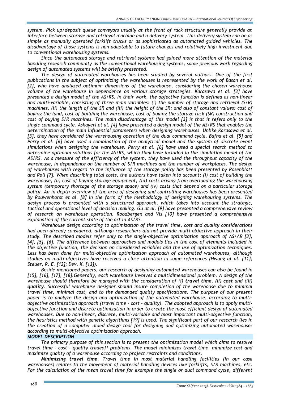 虽然研究人员在研究中没有提供多目标的方法,但是已经考虑了基于出行时间、成本和质量的优化的仓库设计。所述模型仅参考了AS/AR[3],[4],[5],[6]。的单目标优化方法。方法和模型的区别在于目标函数中包含的元素的成本、考虑变量的决策和优化技术的使用。自动化仓库多目标优化方法的研究较少,但多目标优化方法的研究在一些文献中得到了广泛的关注.(Hwang at al. [11];Steuer, R. E. [12];Dev,k[13])。