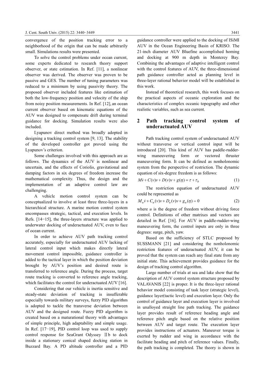 一种车辆的运动控制系统可以在至少三个三层的层次结构上概念化。来自海洋的运动控制系统包括战略,战术和执行水平。在参考文献[14-15],即使是在面对洋流时,三层结构应用的欠驱动AUV水下对接。