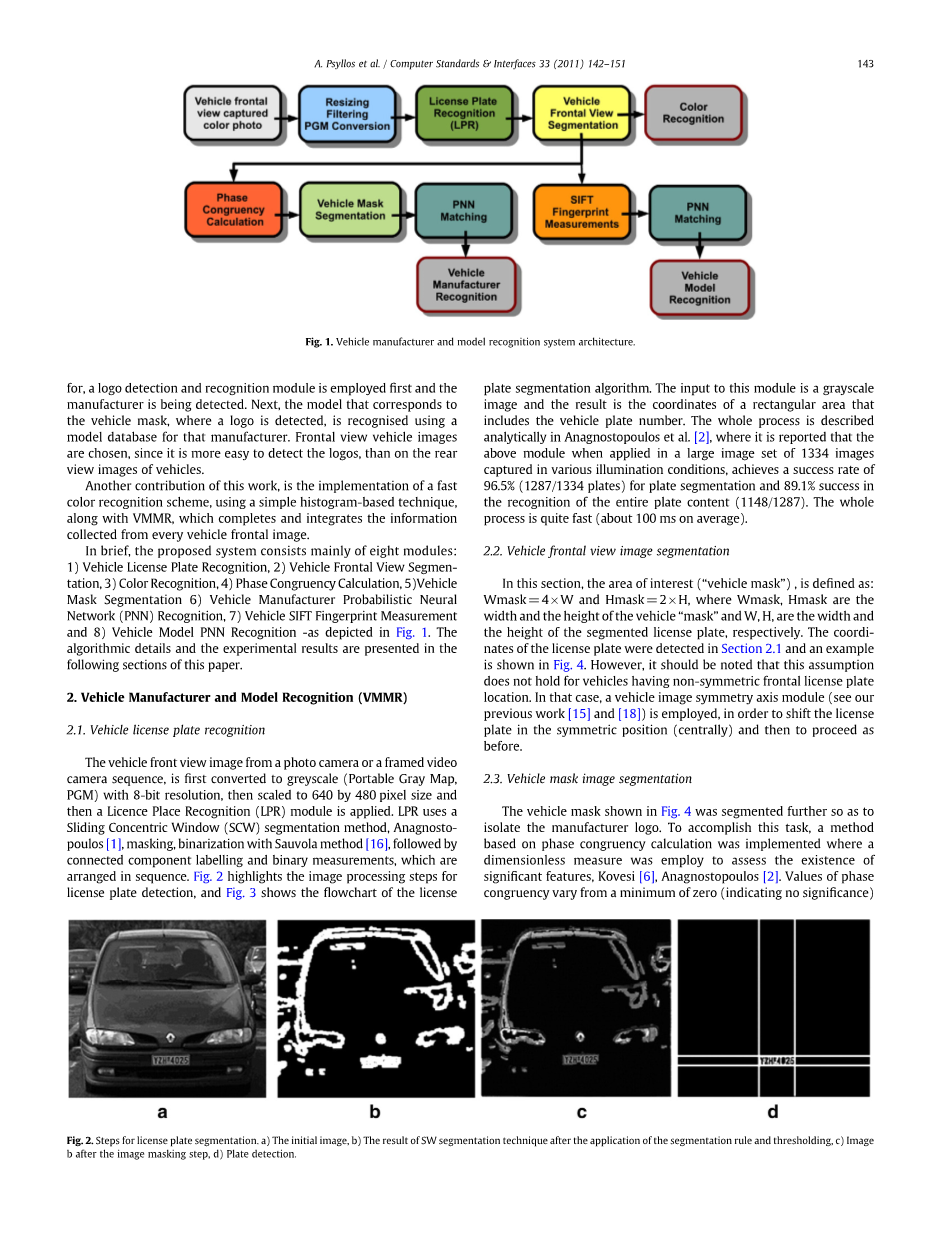 在这个研究中,提出了一个旨在获得可靠VMMR系统,首先检测感兴趣区域的车辆,在车辆正面图像中进行车牌定位和其他特征元素的采集,包括头灯,格栅和标志区,从此之后被称为“汽车面具形象”。如果需要的话,对称轴模块被用来验证和调整中央分段的正面“车辆面具形象”。然后,使用一个叫做相位一致的特殊的图像处理技术,进行制造商标志的检测和分割(见2.3节)。