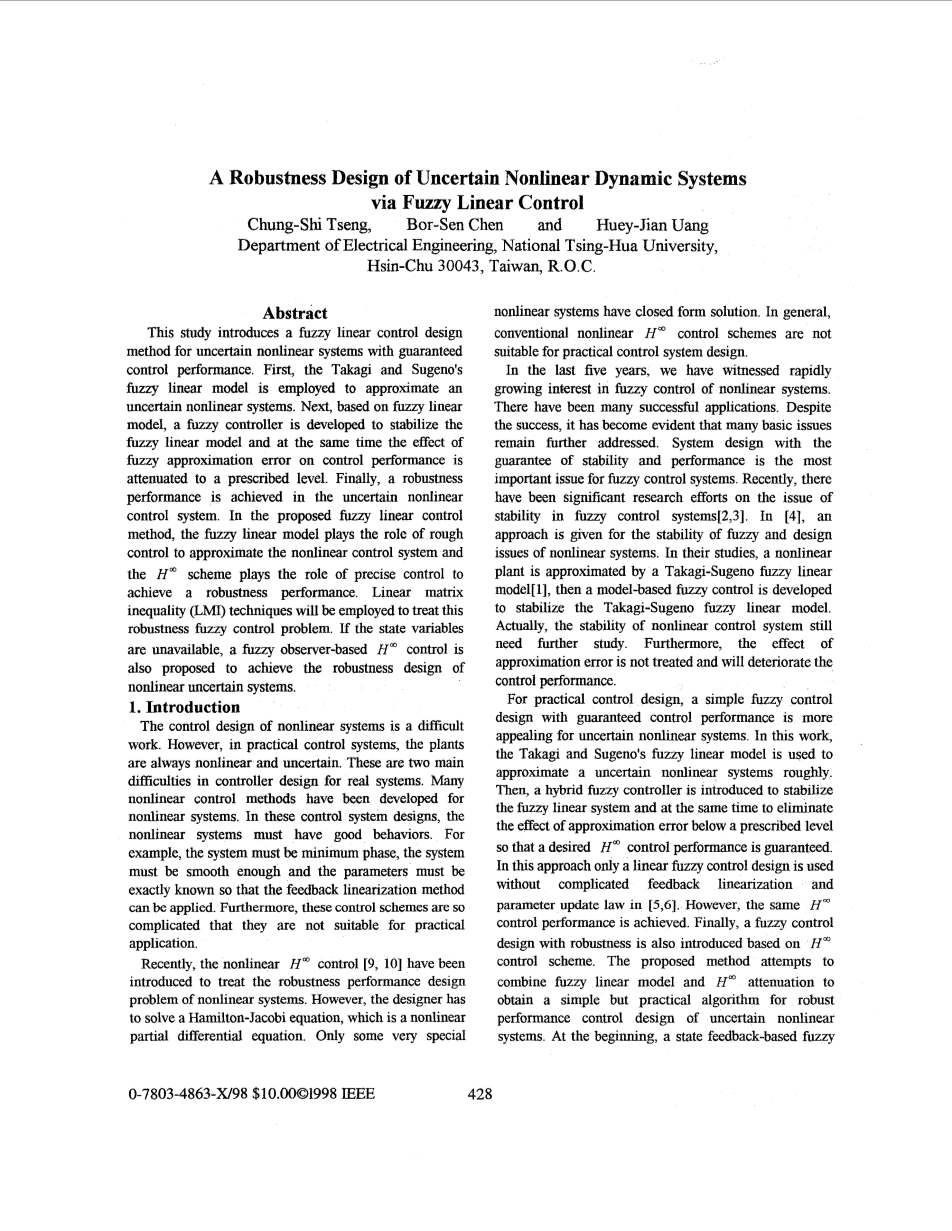 这项研究引入了模糊线性控制设计方法用于保证不确定非线性系统的控制性能。首先,高木和关野的模糊线性模型采用近似的