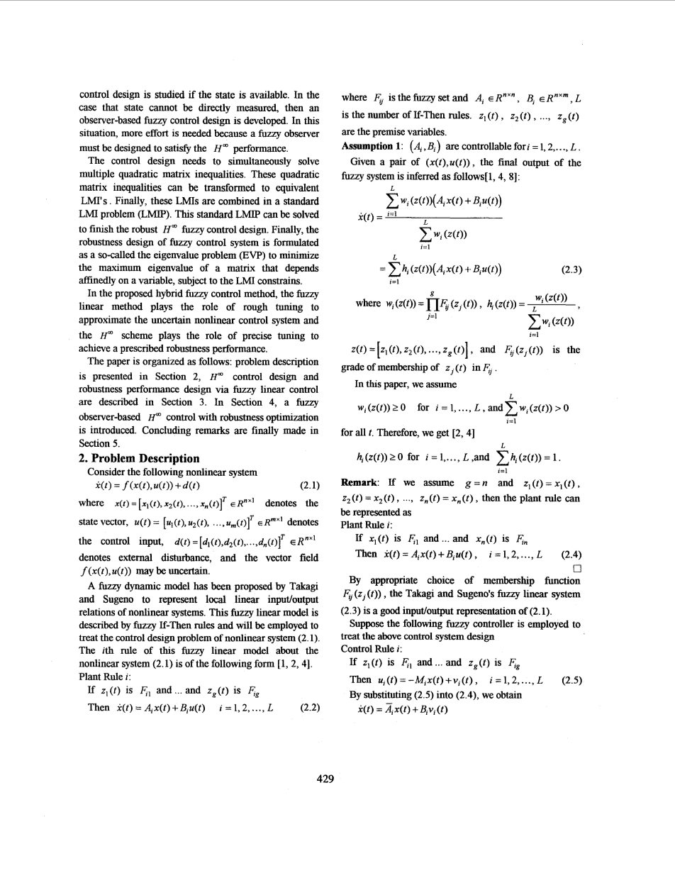 最近,非线性Hinfin;控制[9,10]已被用来处理非线性系统的鲁棒性设计问题。然而,设计师必须解决汉密尔顿 - 雅可比方程,这是一个非线性偏微分方程。只有一些非常特殊的非线性系统有封闭形式的解决方案。在一般情况下,传统非线性Hinfin;控制方案不适合实际控制系统设计。