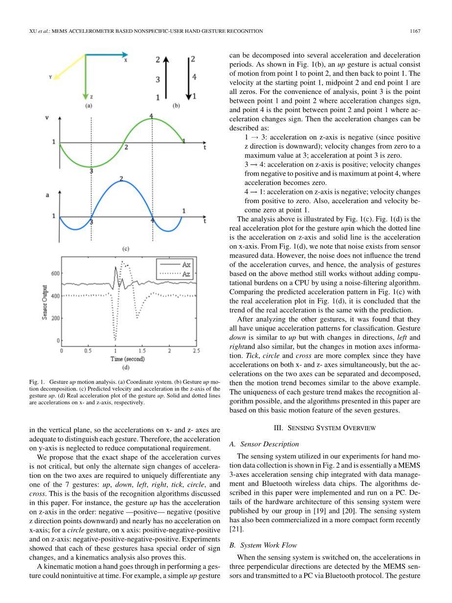在我们的日常生活中,人机交互的增加使得用户界面技术越来越重要。肢体语言直观的表达将大大缓解交互过程,使人类更自然控制计算机或机器。例如,在遥控机器人领域,机器人奴隶已经能够跟着主人远程的手部动作运动[1]。其他被提及的识别手势的应用领域包括在3D空间使用惯性传感器进行角色识别[2],[3],手势识别远程控制电视机[4],使用手作为三维鼠标[5],在虚拟现实里用手势作为控制机构[6]。此外,手势识别还被提出用于了解音乐控制器[7]的动作。在我们的工作中,一个基于微型MEMS加速度计的识别系统被构建了出来,该系统可以在3D空间识别7种手势。该系统还具有潜在的用途,例如可以作为视觉和音频设备的遥控器,或作为一种控制办公室及工厂的机器和智能系统的控制机制。