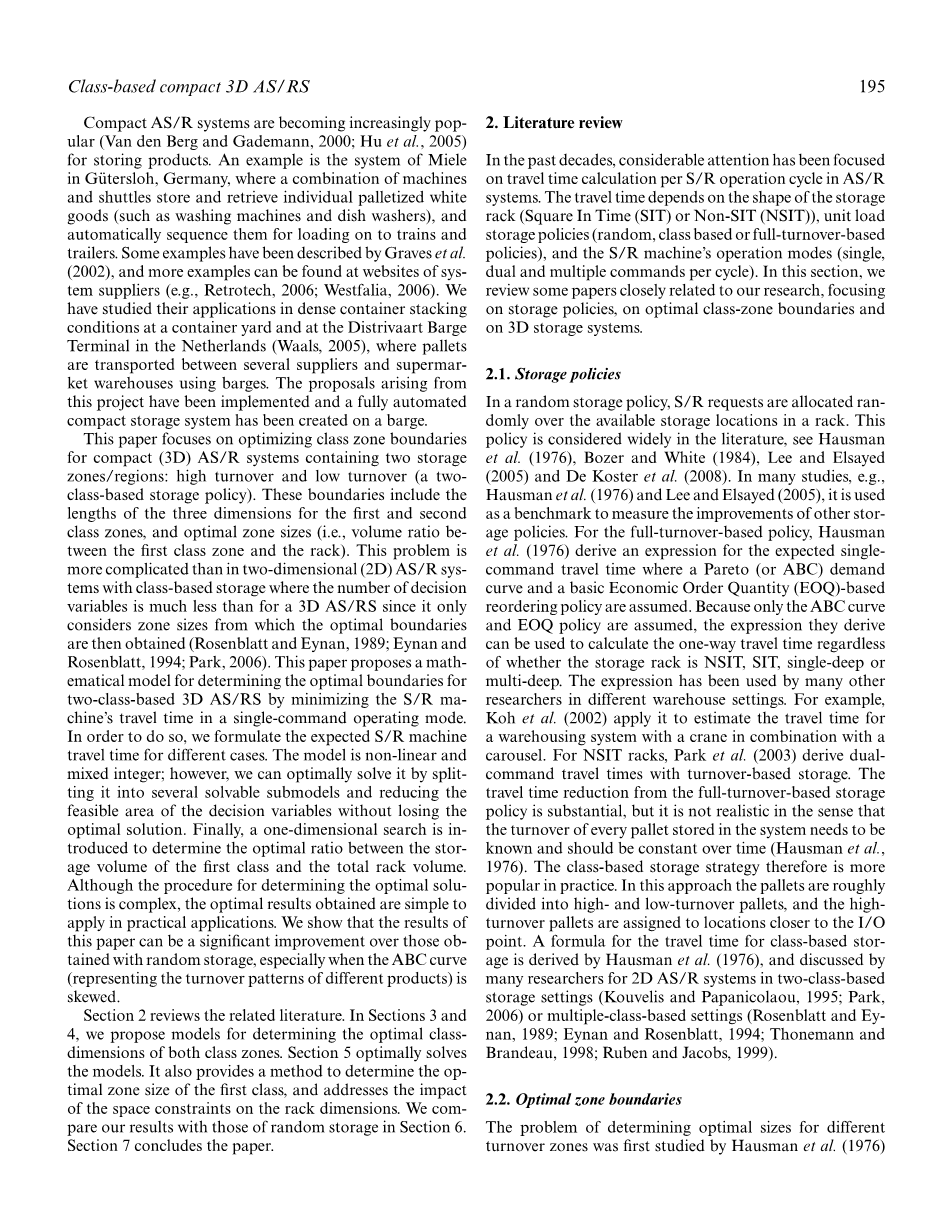 基于类的存储策略在实践之一最重要的是对传统平面仓库存储策略的研究。最优区边界类存储被许多研究人员广泛研究(e.g., Rosenblatt 和 Eynan (1989) 和 Park (2006)), Hausman 等人 (1976)之后做了相似的工作。然而,只有很少一部分论文(e.g.De Koster 等人 (2008)) 提到了定位立体化密集自动存取系统以及立体化的研究基于类的存储问题自动存取系统是处于起步阶段。 作为第一篇研究基于类的密集的存储立体仓库系统优化的目的货架设计和存储边界的论文,本文填补了这个空白。