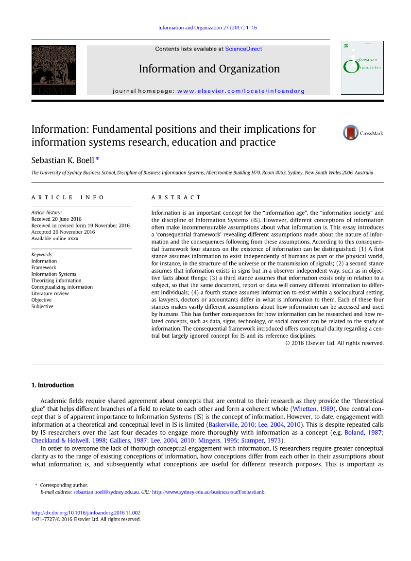 Schwartz(2014)认为,IS学科的发展意味着“以信息为主要工具”(Schwartz,2014,第10页,原文强调)。然而,在1987年,博兰已经发现了IS研究者布尔的失败。《信息和组织》27(2017)1-16探讨,一开始就困扰着信息系统研究的一个问题是信息本身难以捉摸的性质,以及我们作为研究人员未能解决的工作中信息的本质(第363页)。不幸的是,在博兰观察后的几十年里,没有取得多大的进展(Baskerville,2010; Car
