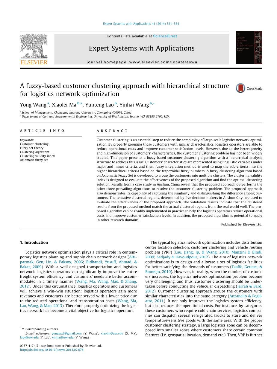 摘要:客户聚类是降低大型物流网络优化复杂度的重要步骤。通过对具有类似特征的客户进行适当分组,物流运营商能够降低运营成本、提高客户满意度。然而,由于异质性而高维度的客户特征,客户聚类问题一直没有得到广泛研究。本文提出了一种基于模糊聚类的层次分析结构的客户聚类算法,它用于解决此问题。顾客的特征用主、次标准的语言变量表示,然后,采用模糊综合方法将主、次准则映射到基于梯形模糊数的更高层次准则。一种基于模糊聚类的算法在公理化模糊集的基础上,提出了将用户分组为多个集群。聚类有效性指标用来来评价该算法的有效性,并找到最优聚类。中国安顺市的一个案例的解决方案研究结果表明,该方法优于其他三种解决客户聚类问题的常用算法。本文提出的聚类方法同时也展示了其捕捉相似性和区分客户差异的能力。安顺市五个决策者确定的试验性聚集区用于评估建议方法的有效性。验证结果表明该方法的结果与实际聚类区域吻合较好。提出的该算法在实际中可以很容易地实现,以帮助物流运营商减少运营成本、提高客户满意度。此外,所提出的算法具有应用潜力在其他研究领域。