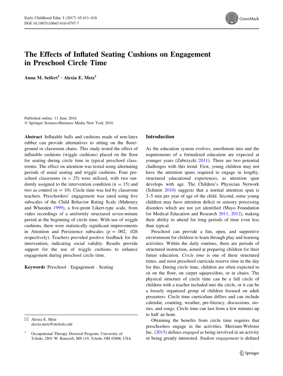 由于非胶乳橡胶制成的充气球和垫子可以代替坐在地板或教室椅子上。本研究在典型的学前教室中,测试了放置在地板上的充气垫子(可摆动的垫子)在围成圈时的效果使用普通坐垫和摆动坐垫交替使用的时间测试了它们之间对儿童注意力的影响。采用4间幼儿园教室(n = 25),随机分为干预组2间(n = 15),对照组2间(n = 10)。圆圈时间由课堂老师带领。学龄前儿童的参与度使用儿童行为评定量表的五个亚量表(Mahoney and Wheeden 1999)进行评分,这是一个李克特式的五分制量表,从一段均匀结构的七分钟周期的视频记录开始。使用wiggle buffer后,注意力和持久性子量表有统计学意义的改善(p = .002, .026)。教师对干预提供了积极的反馈,表明干预具有社会效度。研究结果支持使用摆动坐垫来提高幼儿在学前活动期间的参与度。