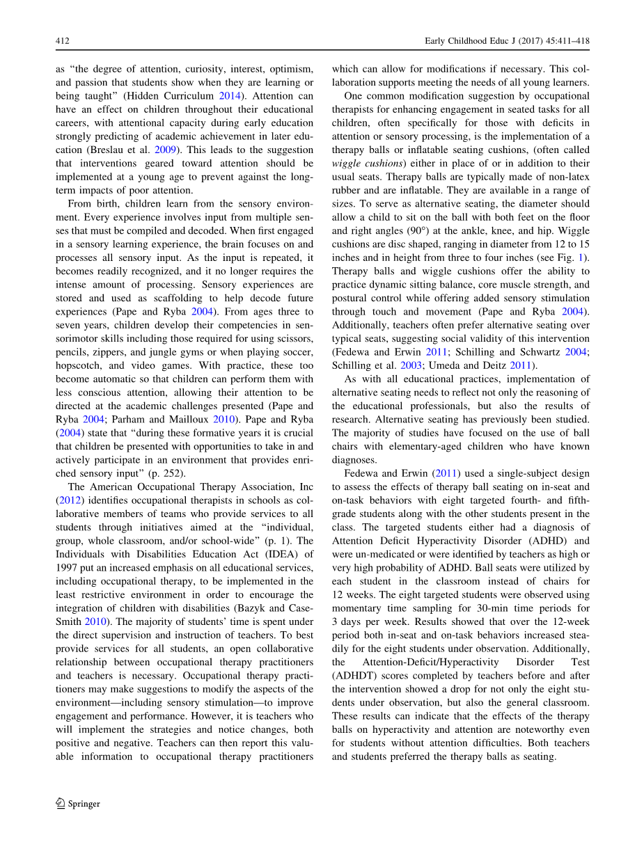 一个常见的修改建议为提高职业治疗师参与坐在任务对所有儿童,通常专门为那些赤字的关注或感官处理,是实现治疗球或充气座椅坐垫,(通常称为缓冲摆动)代替或除了通常的座位。治疗球通常由非乳胶橡胶制成,可充气。它们有各种尺寸可供选择。作为替代座位,直径应该允许孩子坐在球上,双脚放在地板上,脚踝、膝盖和臀部成直角(90)。摆枕为碟形,直径12 - 15英寸,高度3 - 4英寸(见图1)。治疗球和摆动坐垫提供了练习动态坐姿平衡、核心肌肉力量和姿势控制的能力,同时通过触摸和运动提供额外的感官刺激(Pape和Ryba 2004)。此外,教师往往更喜欢替代座位,而不是典型的座位,表明这种干预的社会有效性 (Fedewa and Erwin 2011;Schilling和Schwartz 2004;Schilling et al. 2003;Umeda和Deitz 2011)。