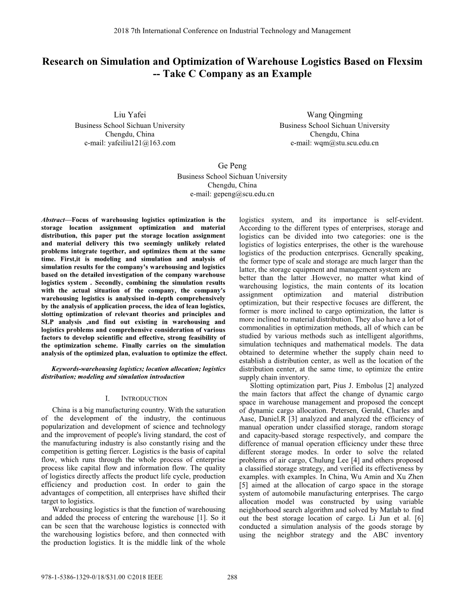 中国是一个制造业大国。随着工业发展的饱和,科学技术的不断普及和发展,人民生活水平的提高,制造业的成本也在不断上升,竞争日趋激烈。物流是资本流动的基础,它贯穿于企业资本流动、信息流动等整个过程。物流质量直接影响产品的生命周期、生产效率和生产成本。为了获得竞争优势,所有企业都将目标转向了物流。仓储物流就是仓储的功能并添加了进入仓库的过程[1]。所以可以看出仓库物流与之相关仓储物流之前,然后连接生产物流。它是整体的中间环节物流系统,其重要性不言而喻。根据企业的不同类型,存储和物流可以分为两类:一类是物流企业的物流,另一个是仓库生产企业的物流。一般来说,以前的规模和存储类型都要大于后者,存储设备和管理系统比后者好。但是,不管是什么样的仓储物流,其所在地的主要内容分配优化和材料分配优化,但他们各自的重点是不同于前者更倾向于货物优化,后者则是更倾向于物质分配。他们也有很多优化方法的共性,所有这些都可以通过各种方法研究,如智能算法,模拟技术和数学模型。数据获得以确定供应链是否需要建立配送中心,以及的位置配送中心,同时,优化整个供应链库存。开槽优化部分,Pius J. Embolus [2]进行了分析影响动态货物变化的主要因素仓库管理空间并提出了概念动态货物分配。彼得森,杰拉德,查尔斯和Aase Daniel.R [3]分析并分析了效率分类存储下的手动操作,随机存储和基于容量的存储分别进行比较这三者下的手动操作效率的差异不同的存储模式。为了解决相关问题航空货运问题,Chulung Lee [4]等人提出了一种分类存储策略,并通过实例验证了其有效性。举个例子,在中国,吴阿敏和徐震[5]旨在分配仓库中的货物空间汽车制造企业制度。货物分配模型是用变量构造的邻域搜索算法并通过Matlab求解出货物的最佳储存地点。李军[6]对商品储存进行了模拟分析使用邻居策略和ABC库存分类调度策略,分别和结论ABC库存的放养率分类调度策略相对较低但是稳定,而新的改进邻居策略库效率明显较高,但在某些情况下存在会有更大的波动性。材料分布优化部分曹振新,朱云龙等[7]结合实际情况材料设计的ANDON系统满足拉力系统和混合车中的看板操作系统装配线准时交货要求。李金航,黄刚等[8]建立了路径优化模型在多模糊条件下,并证明了算法可以有效地解决模糊问题能够有效地指导物资的分配作坊。 CHOIW [9]开发了一种动态材料分配系统,能够及时预测生产所需的零件数量和类型生产线。CL Lai,WB Lee和WH Ip [10]建议结合JIT和看板,然后构建建模和进行模拟研究。 国内外对此的研究很少货物的分配和组合优化物料输送。本文的目的是将两者结合起来优化仓储和企业的物流,充分发挥分配优化和材料的潜力分配优化。