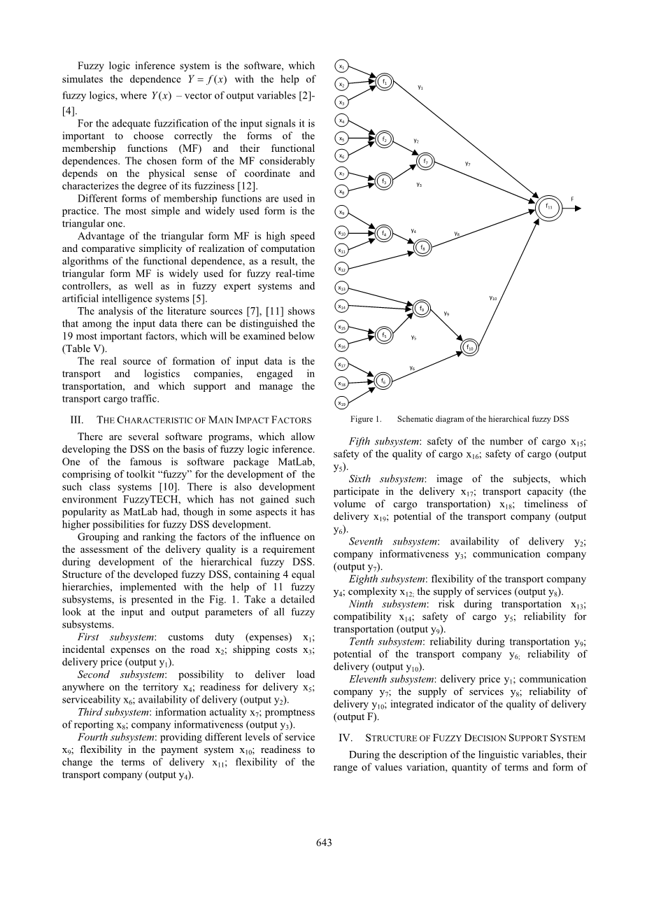 在分层模糊DSS的开发过程中,需要对影响评估交付质量的因素进行分组和排序。在图1中给出了在11个模糊子系统的帮助下实现的包含4个相等层次的模糊DSS的结构。详细了解所有模糊子系统的输入和输出参数。