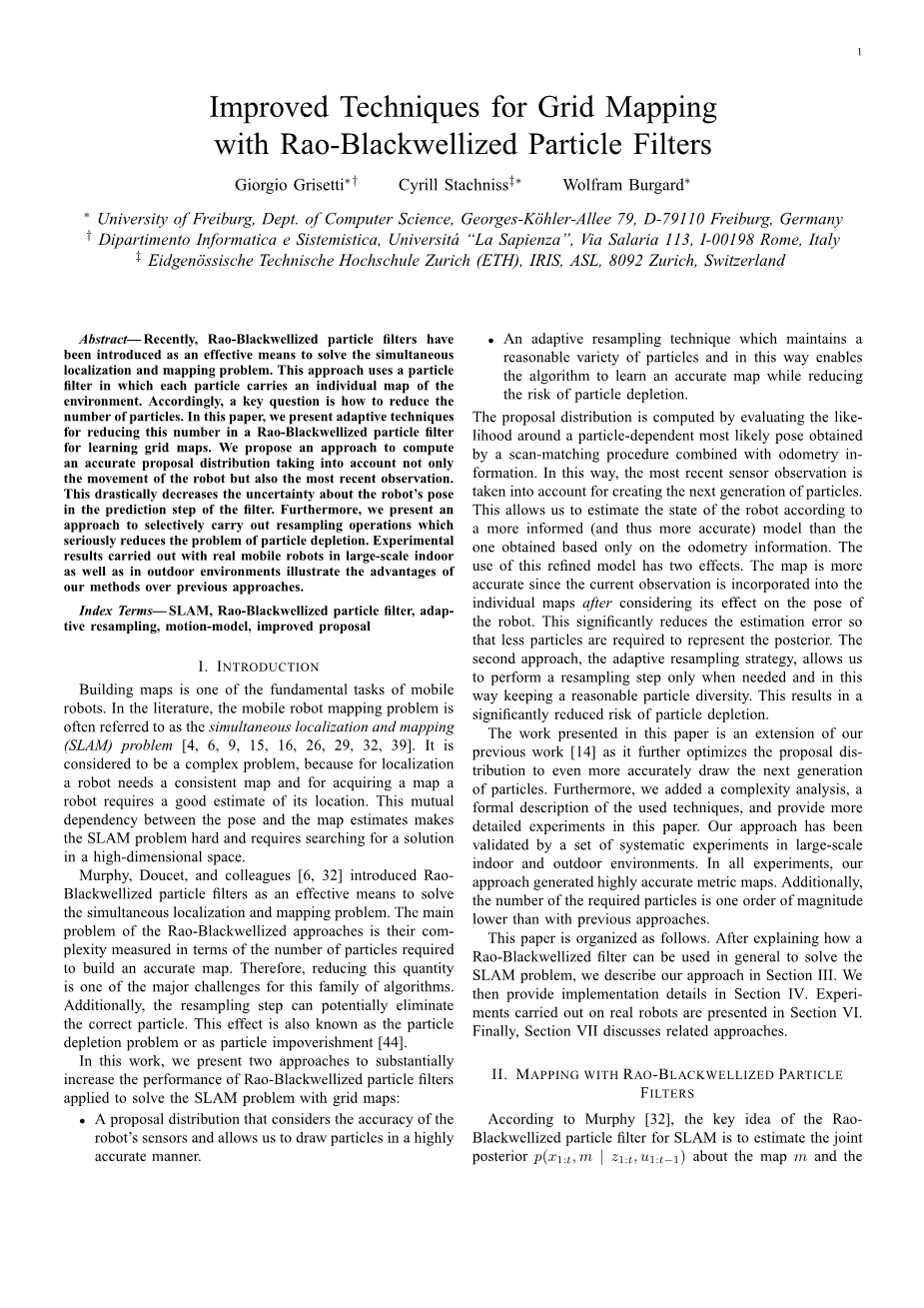 本文介绍的工作是我们之前工作的延伸[14],因为它进一步优化了提议分布,以便更准确地绘制下一代粒子。 此外,我们还增加了复杂性分析,对所用技术的形式描述,并在本文中提供了更详细的实验。 我们的方法已经在大规模的室内和室外环境中通过一系列系统实验得到了验证。 在所有实验中,我们的方法生成高度精确的度量图。 另外,所需粒子的数量比先前方法低一个数量级。