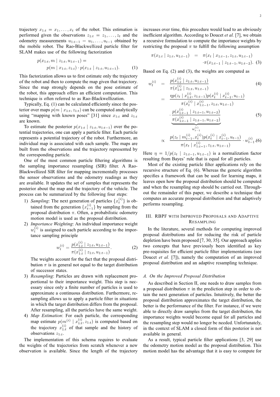 大多数现有的粒子滤波器应用都依赖于公式(6)的递归结构。 虽然通用算法指定了可用于学习地图的框架,但它保留了应如何计算提案分布以及何时应执行重采样步骤的开放性。 在本文的其余部分中,我们描述了一种计算准确的提案分布并自适应地执行重采样的技术。