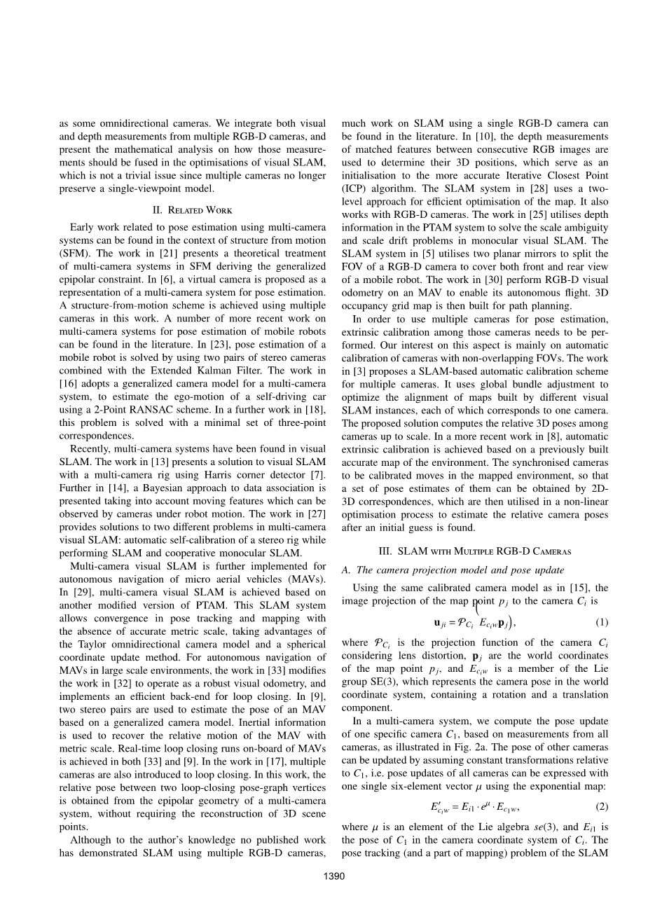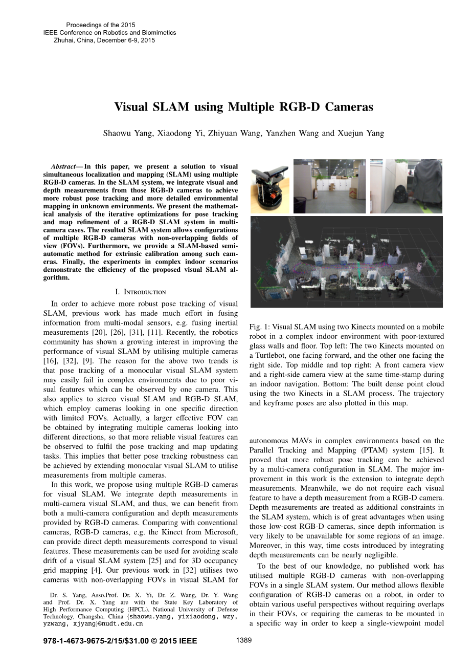 虽然据作者所知,还没有发表的作品展示过使用多个RGB-D相机SLAM,但是在文献中可以找到很多关于使用单个RGB-D相机SLAM的研究。在[10]中,使用连续RGB图像之间匹配特征的深度测量来确定它们的3D位置,这是对更精确的迭代最近点(ICP)算法的初始化。[28]中的SLAM系统使用两层方法来高效地优化地图。它也适用于RGB-D摄像机。[25]中的工作利用PTAM系统中的深度信息解决了单目目视SLAM中的尺度模糊和尺度漂移问题。[5]中的SLAM系统利用两个平面镜子分割RGB-D摄像机的FOV,覆盖移动机器人的前后视图。[30]中的工作在MAV上执行RGB-D视觉里程测量,使其能够自主飞行。然后构建三维占用网格图进行路径规划。为了使用多台摄像机进行位姿估计,需要对多台摄像机进行外部标定。我们在这方面的兴趣主要集中在无重叠fov相机的自动标定上。[3]文献中的工作提出了一种基于SLAM的多摄像机自动标定方案。它使用全局bundle adjustment来优化不同可视SLAM实例构建的地图的对齐,每个可视SLAM实例对应一个摄像机。提出的解决方案按比例计算摄像机之间的相对三维姿态。在[8]最近的一项工作中,自动外部校准是基于之前构建的准确的环境地图实现的。将同步相机在地图环境中进行运动标定,通过2D-3D对应得到一组同步相机的位姿估计,然后进行非线性优化处理,得到初始猜测后的相对位姿估计。