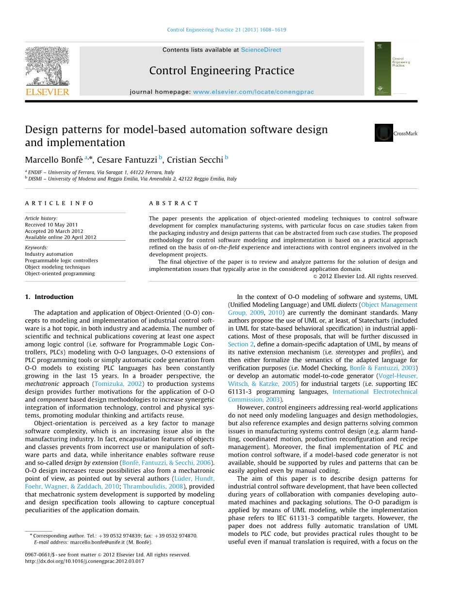 在软件和系统的面向对象建模的环境下,UML(统一建模语言)和UML方言(对象管理语言,2009,2010)是目前的主要标准。 许多作者提出在工业应用中使用UML或至少使用UML状态图(包含在UML中用于基于状态的行为规范)。这些提议大多数将在第2节中进一步讨论,通过其天然的扩展机制的装置(即定型和型材)定义UML的特定于域,然后或者正规化语言的验证其目的的语义 (即模型检查,Bonfe和Fantuzzi,2003)或开发用于工业目标的自动模型到代码生成器(Vogel-Heuser,Witsch,&Katzke,2005)(即支持IEC 61131-3编程语言,国际电工委员会,2003)。