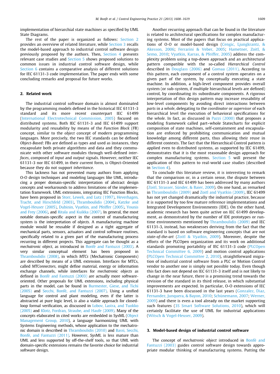 另一种反复出现的可以在文献中找到方法涉及复杂制造系统的架构规范。大多数论文侧重面向对象或基于模型的设计的实际应用(Cengic,Ljungkrantz,&Akesson,2006; Ferrarini&Veber,2005; Hametner,Zoitl,&Semo,2010; Vyatkin,Karras,&Pfeiffer,2005)使用自上而下的方法和与Douglass(2006)和Gomaa(2011)中描述的所谓的分层控制兼容的架构模式来解决复杂性问题。根据该模式,控制系统的每个组件通过概念上执行状态机来在系统的给定部分上操作。此外,高级组件通过协调其从属组件来提供整个系统(或子系统,如果定义了多个层级)控制。这种设计模式的严格解释可能通过避免部件之间的直接相互作用在一个整体,委托给各等级级别的协调器或主管行为规格为整体的执行增加低层组件的可重用性。事实上,正如Pazzi(2000)所讨论的那样,提出了一种称为部分整体状态图的建模框架,用于显式组合状态机,通过禁止不同部分之间的通信和相互知识来实现​​自包含和封装,从而允许它们重用在不同的背景下。如IEC 61499所支持的那样,分层控制模式甚至应用于分布式系统,这表明它是复杂制造系统最合理的设计方法。第5节将介绍这种模式在实际案例研究中的应用(见第4节)。
