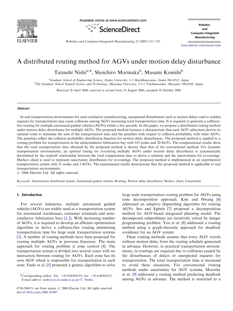 关键词:自动分布式系统;自动引导小车;路径规划;运动延迟扰动;马尔可夫链;不确定