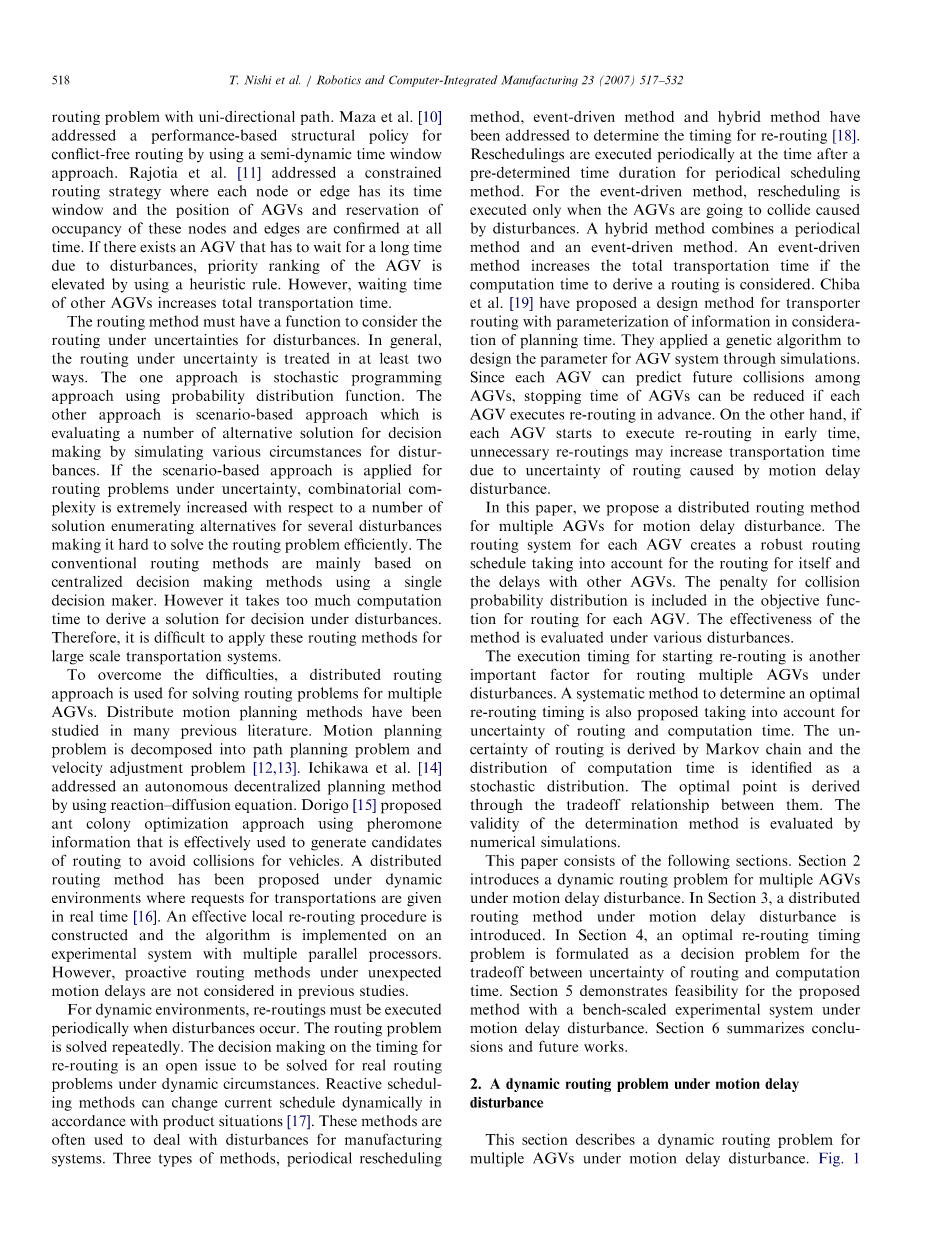 为了这个克服问题,分布式路径规划方法被用于解决多个AGV的路径规划问题。分布式动态规划方法已在以前的许多文献中进行了研究。规划问题被分解为路径规划问题和速度调整问题[12,13]。 Lchikawa et al [14]通过使用反应扩散方程来解决自主分散的规划方法。 Dorigo [15]提出了使用信息素信息的蚁群优化方法,该信息被有效地用于生成路径选择以避免车辆碰撞。分布式路径规划方法已经在动态环境下被提出,在这种环境下实时传输请求[16],构建有效的本地重新路径规划过程,并在具有多个并行处理器的实验系统上实现该算法。然而,在以前的研究中提出的是不考虑在意外运动延迟下的动态路径规划方法。