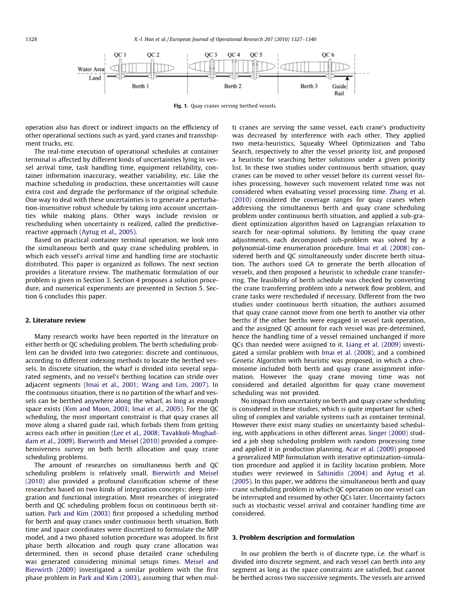 码头由多个泊位组成,使船舶可以同时靠泊。因此,提出了如何同时分配泊位和岸桥的问题。我们称同时讨论泊位分配与岸桥调度的问题为泊位分配与岸桥调度(BACAP) [7]. 泊位分配不仅与岸桥的数量有关,与岸桥的布置同样息息相关。由于岸桥不能自由移动所以岸桥的布置就更显得至关重要。术语中同样称此问题泊位分配与岸桥调度问题(BACAP)[8]。集装箱的移动取决于靠泊地点与堆放地点之间的距离。距离的差异会对内务开支产生影响[ 9 ] [ 10 ] [ 11 ]。船舶泊位分配面临着包括船舶到达的不确定性和货物数量的变化性在内的诸多不确定性。Zhen et al [12] 和Zhen amp; Chang [1]提出了两种应对船舶到达不确定性的策略,即主动策略和被动策略。主动策略是在制定调度模型(基线调度)时,通过引入不确定性因素来完成的策略,而被动策略是通过对基线调度进行调整来实现的策略。