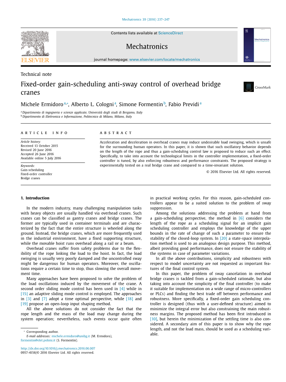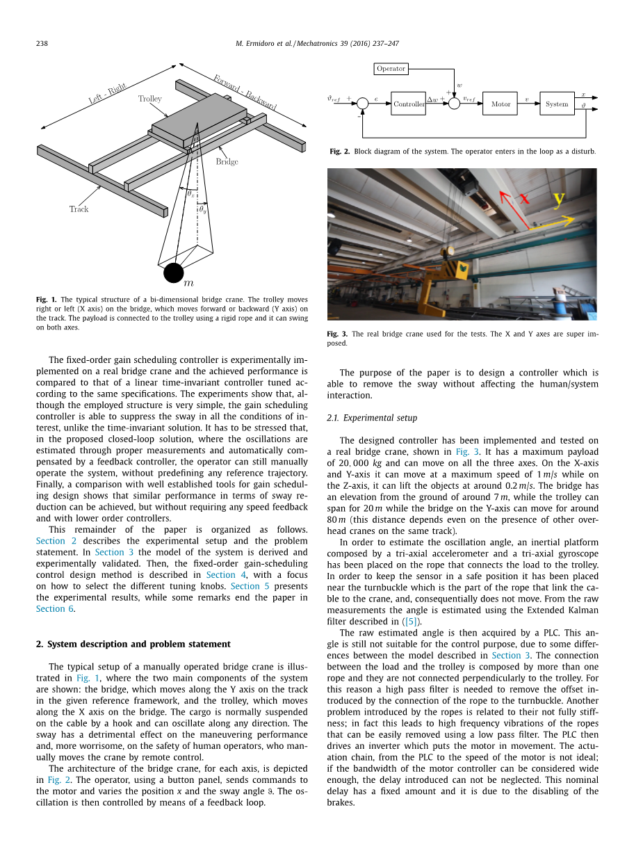 在本文中,桥式起重机的侧移补偿问题是基于一种预定的原理,但也考虑到简单的最后控制器(使它适合实现广泛的微控制器或PLC),找到最好的性能和鲁棒性之间的权衡。更具体地说,设计了一个固定订单增益调度控制器(因此具有用户定义的结构),目的是最小化整体错误,同时也限制了主要的健壮性。在[10]中首次引入了该方法,但也考虑了对沉降时间的最小化。本文的第二个目的是为了说明为什么要将绳子长度,而不是荷载质量作为一个调度变量。