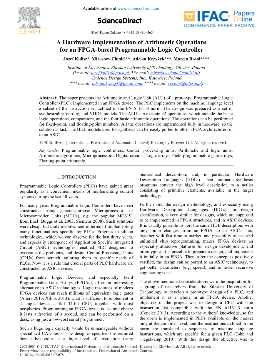关键词:可编程逻辑控制器,中央处理单元,算术逻辑单元,算术算法,微处理器,数字电路,逻辑阵列,现场可编程门阵列,浮点运算。