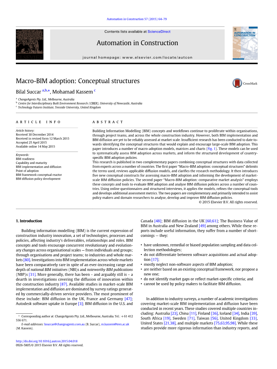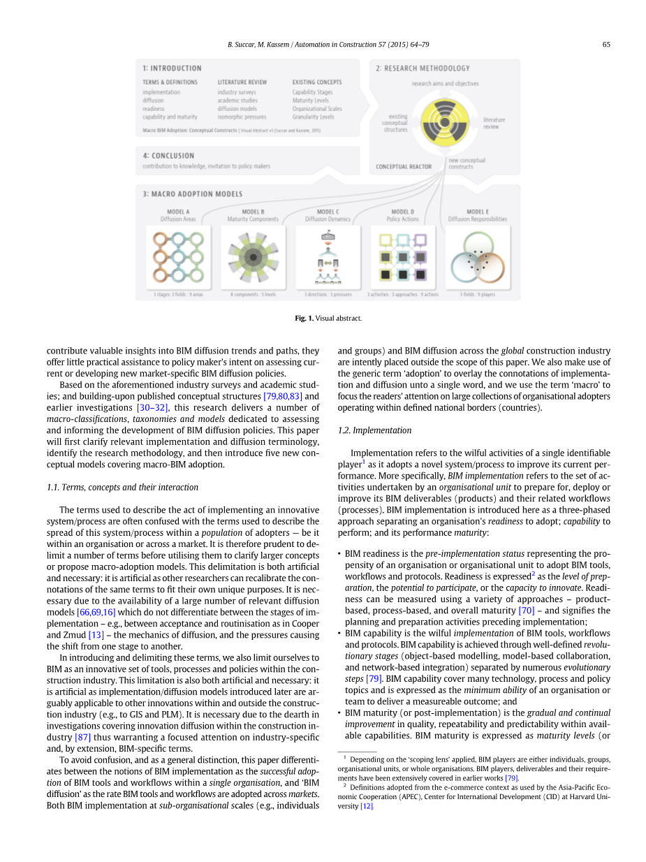 本研究论文发关于两个互补的概念结构来自许多国家的数据。第一篇论文“Macro-BIM应用:概念结构”划入条款使用,审查适用的扩散模型,并澄清这个研究方法,然后介绍了五个新的概念结构评估macro-BIM采用和通知市场规模的发展BIM扩散政策。 第二篇论文“Macro-BIM应用:比较市场分析”引用了这些概念和工具,从而评估BIM实施和分析BIM扩散政策在一些国家的应用情况。 本文使用在线问卷调查和结构化访谈的方式,运用模型、改进的概念工具和开发额外的评估指标。两篇论文是互补的,主要是为了帮助决策者和领域研究人员分析,发展和完善BIM扩散政策。
