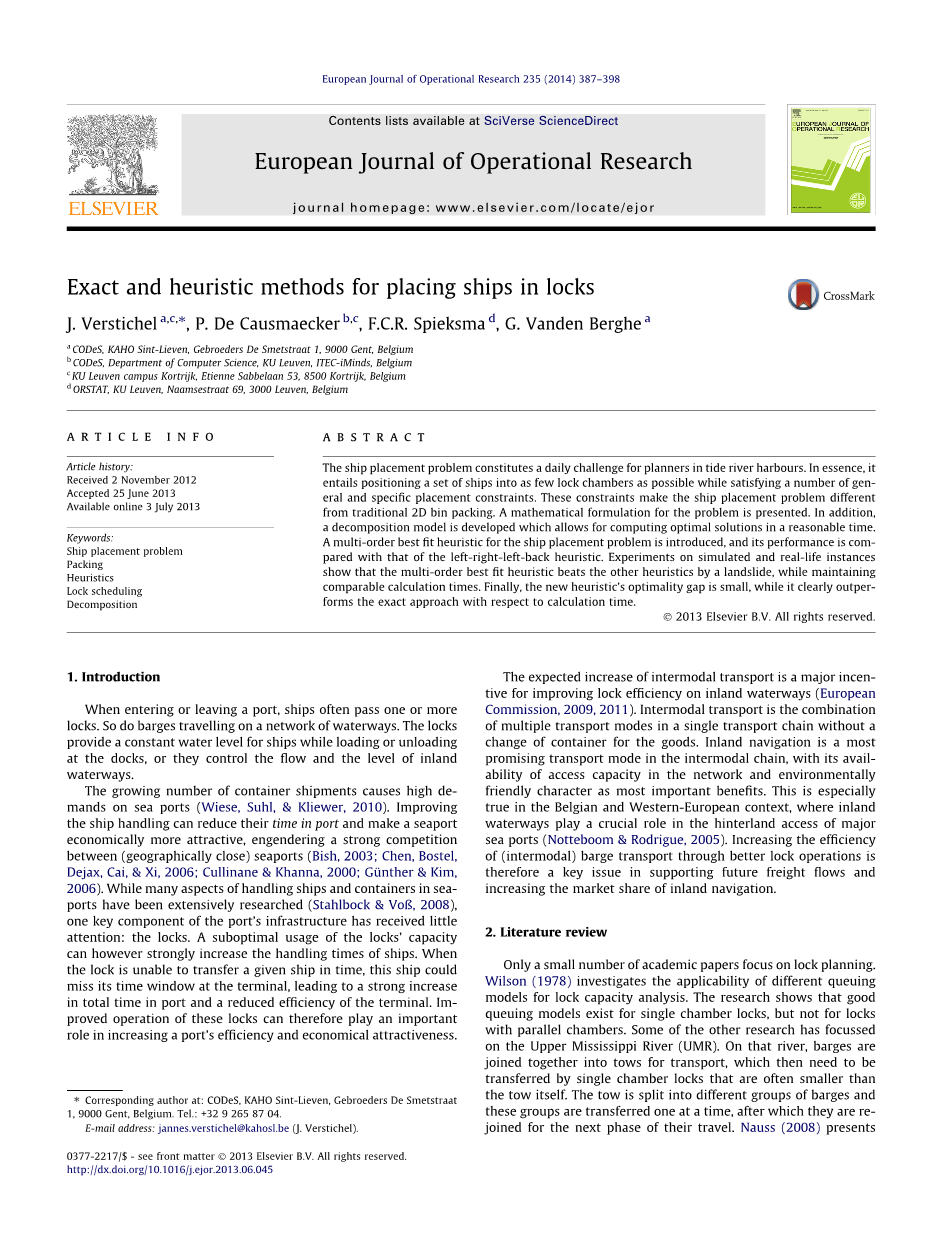 The ship placement problem constitutes a daily challenge for planners in tide river harbours. In essence, it entails positioning a set of ships into as few lock chambers as possible while satisfying a number of general and specific placement constraints. These constraints make the ship placement problem different from traditional 2D bin packing. A mathematical formulation for the problem is presented. In addition,a decomposition model is developed which allows for computing optimal solutions in a reasonable time.A multi-order best fit heuristic for the ship placement problem is introduced, and its performance is compared with that of the left-right-left-back heuristic. Experiments on simulated and real-life instances show that the multi-order best fit heuristic beats the other heuristics by a landslide, while maintaining comparable calculation times. Finally, the new heuristicrsquo;s optimality gap is small, while it clearly outperforms the exact approach with respect to calculation time.