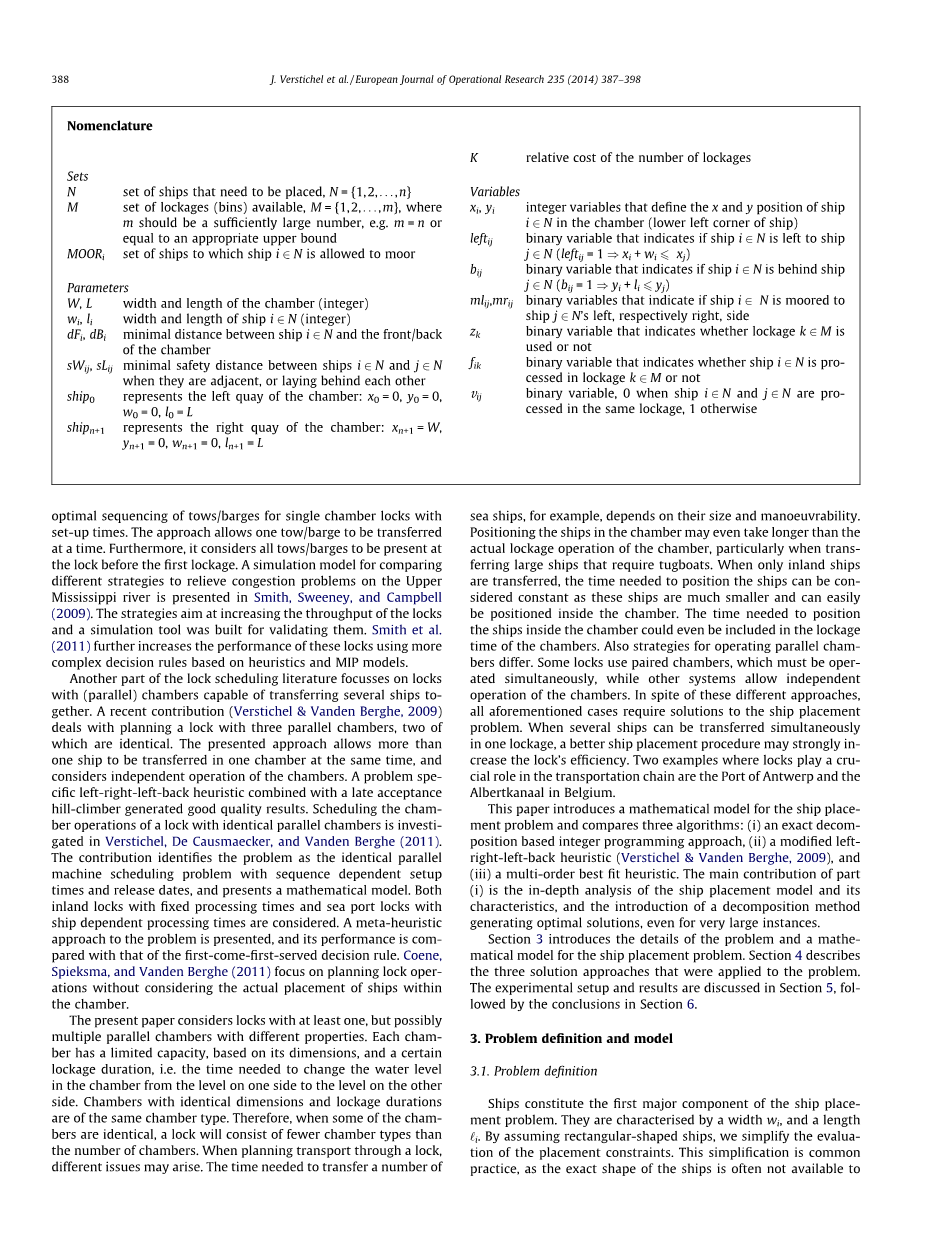 Wilson(1978)研究了不同排队模型对过闸能力分析的适用性。研究表明,单一船闸具有良好的排队模式,但不适用于平行船闸。其他研究集中在密西西比河上游(UMR)。在那条河上,驳船连接在一起成为驳船队伍,然后需要通过一个比驳船本身小的单一船闸来转移。驳船队伍被划分成不同的驳船组,然后这些组一次一个地转移,然后他们返回到下一个行程阶段。 Nauss(2008)提出了具有设置时间的单一船闸的驳船队伍/驳船的最佳分选。这种方法允许牵引一艘拖船。此外,它认为,在第一次过闸之前,所有牵引/驳船将出现在船闸中。史密斯,斯威尼和坎贝尔(2009)提出了一个模拟模型,比较不同的策略以缓解上密西西比河的拥堵。这些策略旨在提高船闸的吞吐量并建立一个模拟工具来验证它们。史密斯等人。 (2011)使用基于启发式和MIP模型的更复杂的决策规则进一步改进了这些船闸的性能。船闸计划文献的另一部分着重于船闸(平行)隔室,这些隔间可以将多艘船舶转移到一起。最近的一项贡献(Verstichel&Vanden Berghe,2009)涉及计划三个平行船闸,其中两个是相同的。考虑到隔室的独立操作,所提出的方法允许将多于一个的容器同时转移到一个隔室中。具有问题特征的左和右启发式技术与晚期接受登山者结合产生了高质量的结果。 Verstichel,De Causmaecker和Vanden Berghe(2011)研究了使用同一个平行船闸的情况。该贡献将问题确定为具有依赖于序列的设置时间和发布日期的相同的并行机器调度问题,并且提出了数学模型。考虑具有固定处理时间的内陆船闸和具有依赖于船的处理时间的海港船闸。提出了对这个问题的元启发式方法,并将其性能与先来先服务的决策规则进行比较。 Coene,Spieksma和Vanden Berghe(2011)关注计划过闸操作,而不考虑舱室内船舶的实际位置。本文考虑了至少有一个但可能多个平行舱室的船闸有不同特性。根据其尺寸,每个腔室具有有限的容量和一定的船闸定持续时间,即将腔室中的水位从一侧的水平改变到另一侧的水平所需的时间。具有相同尺寸和船闸持续时间的腔室是相同的腔室类型。因此,当一些腔室相同时,船闸将由比腔室数量更少的腔室类型组成。通过船闸计划运输时,可能会出现不同的问题。传输一个数EA船舶所需要的时间,例如,取决于它们的尺寸和manoeuvrability.Positioning在腔室中的一般转移要求拖船大型船舶特别是当可能甚至需要更长的时间比所述腔室的实际过闸操作。当只有内陆船舶被转移时,定位船只所需的时间可以被认为是不变的,因为这些船只要小得多,并且可以容易地放置在舱室内。将船舶定位在舱室内所需的时间甚至可以包括在舱室的船闸时间内。并行工作室的策略也不同。有些船闸使用成对的房间,必须同时操作,而其他系统允许独立操作房间。尽管有这些不同的方法,但所有上述情况都需要解决船舶安置问题。当多艘船舶可以同时在一个船闸中转运时,更好的船舶布置程序可能会大大提高船闸的效率。两个示例,其中船闸起到运输链中的关键作用是安特卫普港和Albertkanaal在Belgium.This本文介绍了一种数学模型船放置问题,并比较三种算法:(一)准确的分解基于整数规划的方法, (ii)改进的左 - 右 - 左后启发式(Verstichel&Vanden Berghe,2009),和(iii)多阶最佳拟合启发式。第(i)部分的主要贡献是深入分析了船舶布局模型及其特点,并且引入了分解方法来生成最优解,即使对于大型实例也是如此。第3节介绍了问题的细节和a船舶安置问题的数学模型。第4节描述了应用于该问题的三种解决方案。实验设置和结果在第5节中讨论,随后在第6节中得出结论。