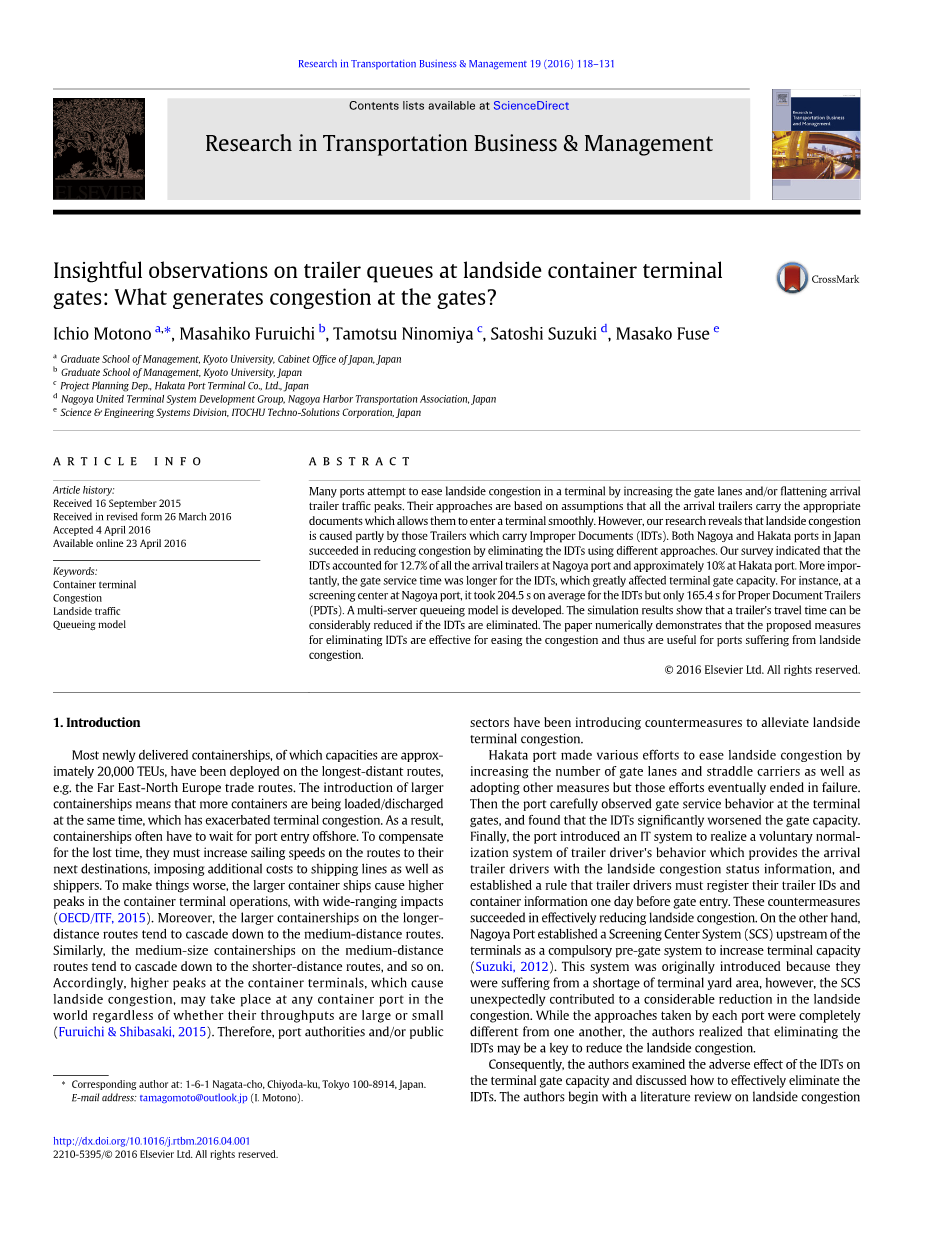 博多港口通过增加门道和跨运车的数量以及采取其他措施来缓解陆地拥堵,但这些努力最终以失败告终。然后,港口仔细观察了码头大门处的航班服务行为,发现IDT大大加剧了航班的通行能力。最后,港口引进了IT系统,实现拖车驾驶员行为自愿规范化系统,为到达拖车司机提供陆地拥挤状态信息,并制定了拖车司机必须在登机前一天注册其拖车ID和货柜信息的规则条目。这些对策成功地有效减少了陆地拥堵。另一方面,名古屋港在码头上游建立了筛选中心系统(SCS),作为强制性预门系统以增加码头容量(铃木,2012)。这个系统最初是因为码头区域短缺而遭到引入的,然而,南海意外地造成了陆地拥堵的显着减少。虽然每个港口采取的方法都是完全不同的,作者意识到消除IDT可能是减少陆地拥堵的关键。