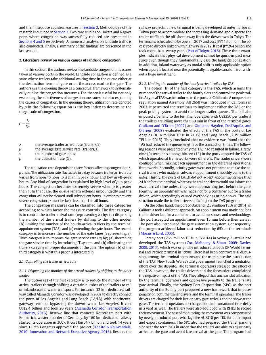 在本节中,作者回顾了世界各个港口采取的陆地挤塞措施。陆地拥挤被定义为拖车在目的地码头门口或通往大门的通道上在队列中需要额外的等待时间的状态。作者使用排队论作为概念框架来系统地概述拥堵措施。该理论不仅用于评估拥堵措施的有效性,还可以解释拥堵的原因。在排队论中,下面公式中用rho;表示的利用率是确定拥塞程度的关键指标。