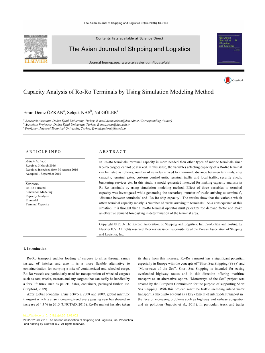 在滚装码头中,由于滚装货物不能堆放,终端容量这方面要比其他类型的海运码头更为需要。从这个意义上说,影响Ro-Ro终端容量的变量可以列举如下:到达终端的车辆数量,终端间距离,船舶容量,码头,海关控制单元,码头交通和本地交通,安全检查,加油服务等。在本研究中,一个用于Ro- Ro终端采用仿真建模方法。在产生情景时,调查了三个变量对终端容量的影响; “到达码头的卡车数量”,“码头间距离”和“滚装船容量”。结果表明,影响终端容量的变量主要是“到达终端的卡车数量”。由于这种情况,认为滚装码头运营商必须考虑优先需求因素,并在确定终端区域时进行有效的需求预测。