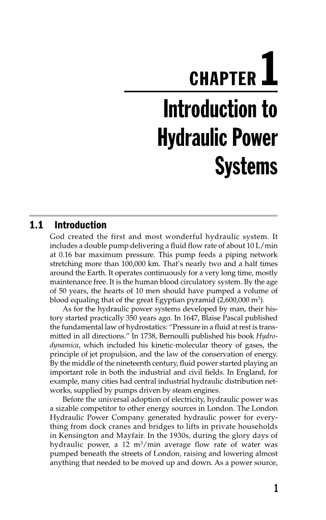 至于人类开发的液压系统,他们的历史大概是在350年前开始的。1647年,布莱斯·帕斯卡尔发表了流体静力学的基本定律:“静止时的流体压力向四面八方传播”。1738年,伯努利出版了他的书《水动力学》,其中包括他的气体动力学分子理论,喷射推进原理以及能量守恒定律。到了十九世纪中叶,流体动力开始在工业和民用领域发挥重要作用。例如在英国,许多城市都有中央工业液压配送网络,由蒸汽机驱动的泵供应。