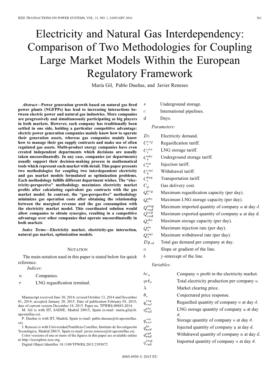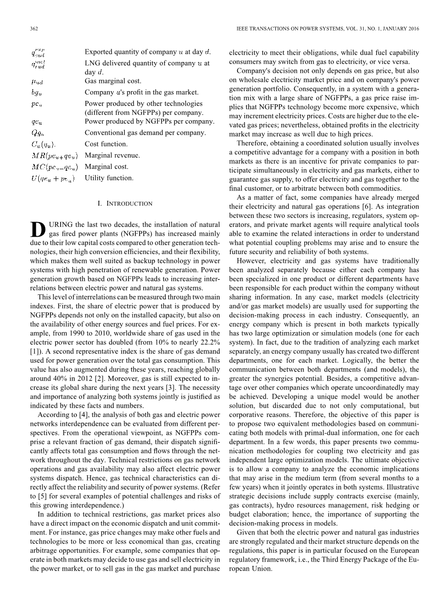 可是,一直以来,电力和天然气系统都是被单独的进行分析,因为要么每个公司专攻一个产品,要么每个产品的不同部门有自己的职责,从不分享信息。无论如何,市场模型(电力或者天然气市场模型)一直用来支持每个工业的决策过程,因此,如今一个占有两个市场的能源公司一般有两个大的优化或仿真模型(一个模型对一个系统)。事实上,由于传统分析中的每个市场是分离的,一个能源公司通常设立两个不同的部门,一个部门对一个市场。逻辑上来说,两个部门(或者模型)之间的交流越好,潜在的协同增效作用就越强。除此之外,相对于那些没有相互协调运作的公司来说,将会产生竞争优势。形成一个独特的模型是另一种方案,但由于计算机和法人的原因而被抛弃。因此,这篇论文的目的就是基于两个有原对偶信息模型间的联系提出两个等价的方法,一个方法对一个系统,简单的说,这篇论文为耦合电力和天然气两个相关的大的优化模型提出了两个联系方法论,最终的目的是当他们在两个系统中共同运作时,实现一个公司分析可能在一个中期期限(几个月到几年)内产生的经济预示。说明性的策略决策包括供应合同练习(主要是天然气合同)、电力资源管理、风险回避或者预算阐述,因此模型中支持决策过程很重要。