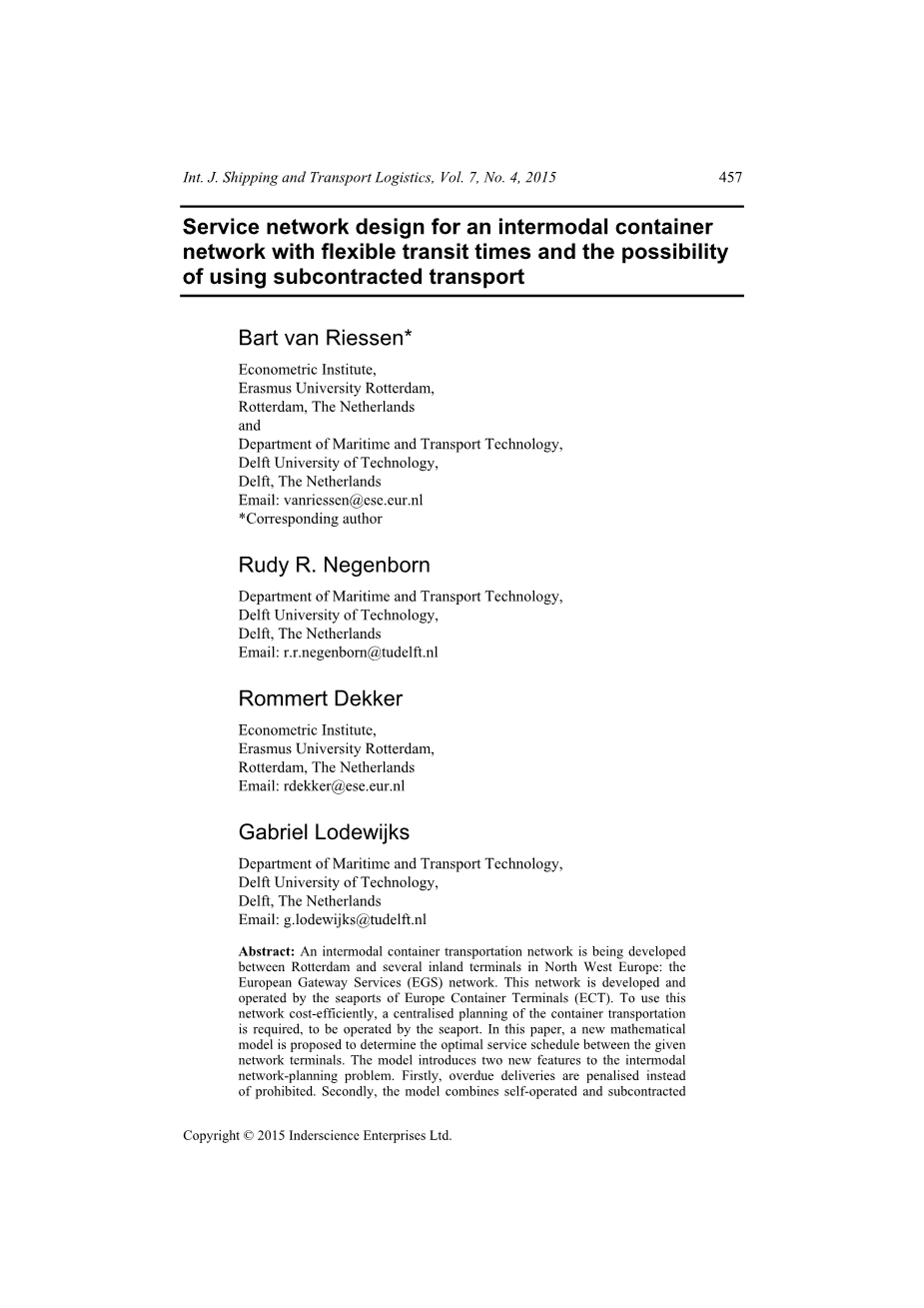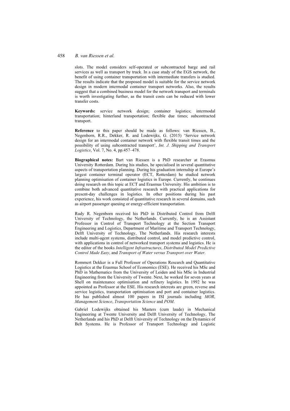 摘要:欧洲西北部的鹿特丹和其他几个内陆码头正在提出一种集装箱多式联运网络:欧洲网关服务(EGS)网络。该网络是由欧洲集装箱码头公司(ECT)的几个海港提出并运营的。为使得这种网络在的使用在经济上合算,这些海港必须提出一个关于集装箱运输的统一规划。这篇论文提出了一种数学模型以确定给定的网络中几个码头之间的最优服务计划表。这种模型引入了两个新的多式联运网络规划问题的功能。首先,逾期交货将会被处罚而不是禁止。其次,该模型包括自营时段和分包时段。该模型考虑对航运、铁路运输、卡车运输都实行自营或分包服务。在关于EGS网络的案例研究中,我们发现,含转运集装箱运输具有明显优点。结果表明,这种新提出的模型适用于现代集装箱多式联运网络的服务网络设计。另外,结果显示,我们理应进一步研究一种综合的针对网络运输和码头的综合商业模型,以通过降低转移成本来减少运输成本。
