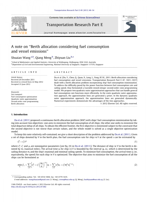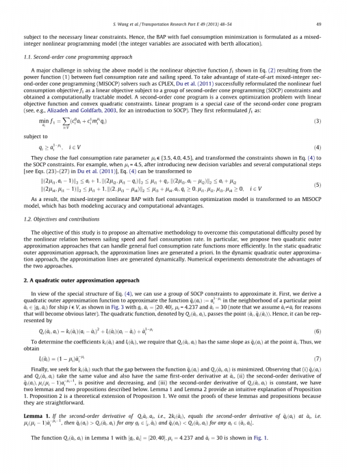 杜等人。[Du,Y.,Chen,Q.,Quan,X.,Long,L.,Fung,RYK,2011。考虑燃料消耗和船舶排放的泊位分配。交通研究部分E 47,1021-1037]涉及船舶燃料消耗最小化的泊位分配问题。为了解决功率函数在燃料消耗率和航行速度之间所带来的困难,他们制定了易处理的混合整数二阶锥规划模型。我们提出了两种二次外近似方法,可以更有效地处理一般的燃料消耗率函数。在静态二次外近似方法中,近似线是先验地生成的。在动态二次外近似方法中,近似线是动态生成的。数值实验证明了这两种方法的优点。