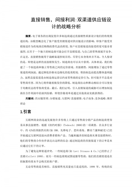 新零售下便利店生鲜食品供应链最优决策问题研究外文翻译资料 2021-11-30 18:52:19 英语原文共 21 页 英语原文共 18 页 原文和译文剩余内容已隐藏,您需要先支付 30元 才能查看原文和译文全部内容!立即支付 发小红书推广免费获取该资料资格。点击链接进入获取推广文案即可: Ai一键组稿 | 降AI率 | 降重复率 | 论文一键排版 PREVIOUS NEXT 您可能感兴趣的文章 一种新的需求响应型城市物流配送业务资源动态分配模型外文翻译资料 以T公司为例,根据基于活动的分类改进库存控制和预测外文翻译资料 新零售条件下生鲜食品家庭配送模式研究外文翻译资料 探索大规模定制作为快递行业创新的潜力外文翻译资料 中国的国内快递业发展战略分析外文翻译资料 有效的物流管理物流 :什么是物流?外文翻译资料 运用层次分析法分析供应链管理的绩效评价外文翻译资料 基于分支切割算法定价的带时间窗口的提货和交货问题外文翻译资料 供应链管理中的电子商务物流:实践视角外文翻译资料 第三方物流服务对客户绩效的贡献外文翻译资料
