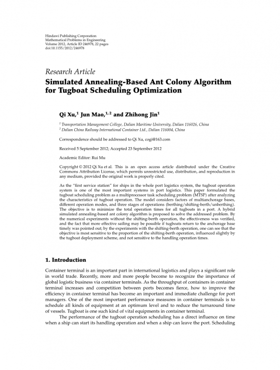 论文的其余部分如下:第二节结合多处理器任务调度问题理论,建立拖轮调度模型。第三节提出了一种基于模拟退火的蚁群算法求解该模型,第四节讨论了蚁群算法在集装箱码头的仿真实验。最后,我们在第5节中得出结论并对未来作出展望。