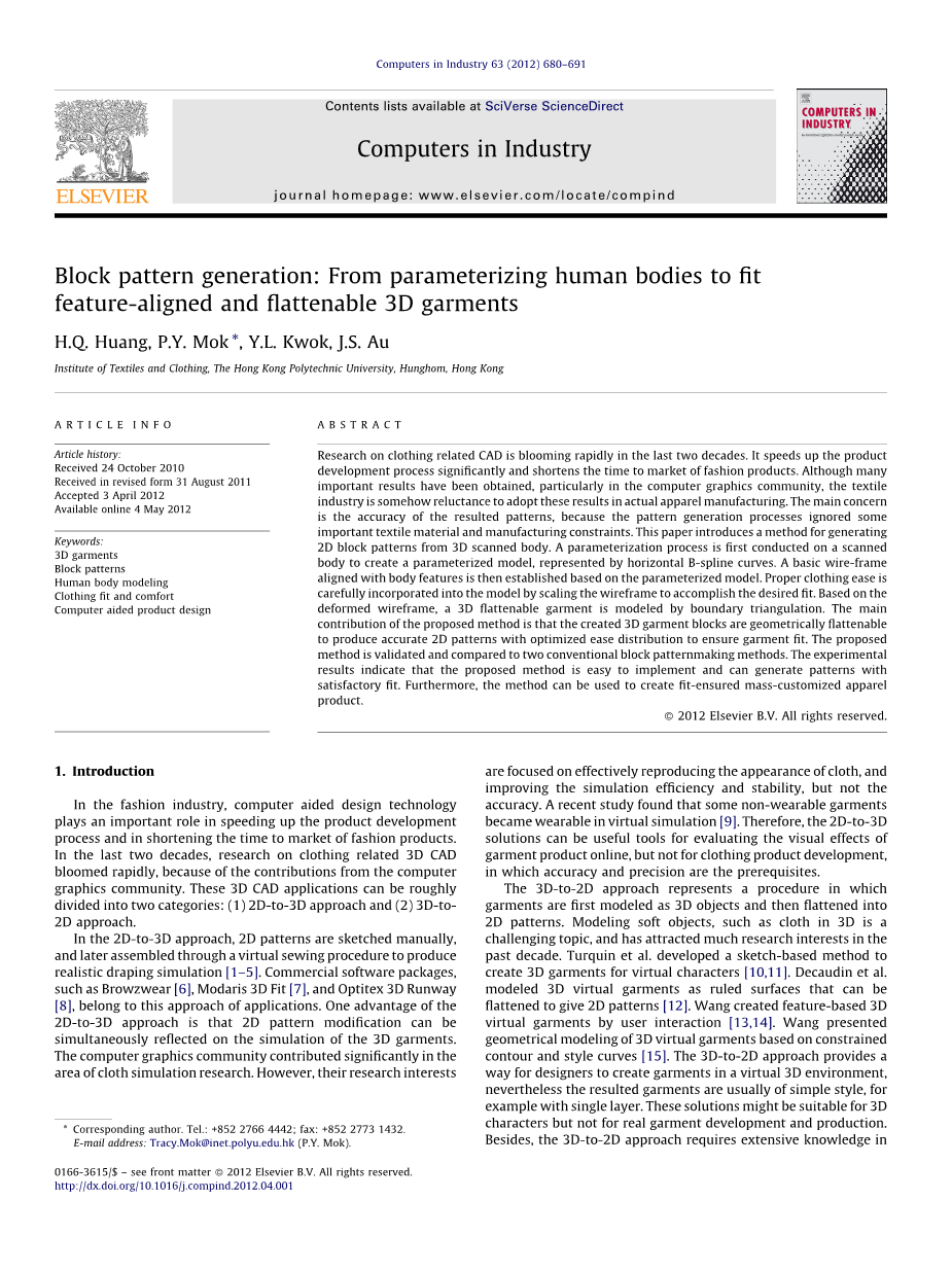 对三维服装进行适当的建模是很重要的,因此要满足纺织材料性能的关键约束,以确保生产模式更适合于实际生产。一种可能的方法是将3D服装与身体特征对齐,以指导随后的扁平化过程。Tang和Chen[52]将最初的可展曲面转化为最终的网格曲面,该曲面内插了一些给定的点或曲线。在变换过程中,保持零值高斯曲率。另一种从一组点或曲线上近似可展曲面的经典方法是[53]。换句话说,给定一个从输入分段光滑曲线中采样的顶点的折线,边界三角剖分是一个无内部顶点的流形三角剖分[54]。本文提出了一种可生成可展三维块体服装的方法,该方法是通过边界三角剖分法提出的,在该方法中,人体的结构线条和特征是通过仔细地结合服装的易度来构造三维扁平的服装的边界。3D模块可以很容易地被压平,因为它是量身定做的。服装为进一步的风格适应。扁平化过程是计算成本低廉,适合工业应用。最近,Au和Ma提出了一种类似的基于NURBS曲面建立可开发的3D衬衫的方法[55]。然而,在他们的方法中,只使用4个基准面和两个辅助参考线来定义一件衬衫的所有特征线。此外,它们的表面生成方法使用两条平行的曲线来定义边界,这使得它们的方法可能不适用于复杂曲面。此外,它们非常简单的特征定义使得该方法仅适用于理想的人体模型,如标准人体模型,而不是非理想的实体模型。它并没有解释eases是如何分布的,也没有解释在他们的方法中是如何定义袖窿曲线的。为了证明所提出的方法适用于工业应用,采用了工业模型和非理想的各种图形类型的真实世界体来验证该方法,并进行了系统的拟合评价实验。