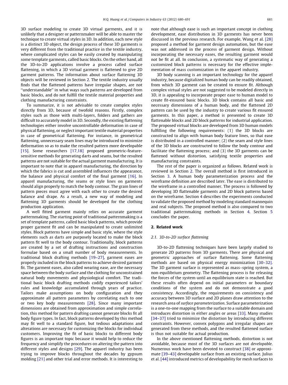 3D-to-2D的方法代表了一种程序,在这个过程中,服装首先被建模为3D对象,然后将其压平为2D模式。对软物体的建模,如3D的布料是一个具有挑战性的课题,在过去的十年中已经吸引了大量的研究兴趣。Turquin等人开发了一种基于草图的方法来为虚拟角色创建3D服装[10,11]。Decaudin等人将三维虚拟服装建模为可被压平的平面图形[12]。Wang通过用户交互创建了基于特征的3D虚拟服装[13,14]。王提出了基于约束轮廓和样式曲线的三维虚拟服装几何建模[15]。3D-to- 2D的方法为设计师在虚拟的3D环境中创造服装提供了一种方法,然而结果服装通常是简单的样式,例如单层。这些解决方案可能适合3D角色,但不适合真正的服装开发和生产。此外,3D到2D的方法需要大量的知识在3D曲面建模可以创建3D虚拟服装,而设计师或模式制造者不太可能掌握3D虚拟样式的技术。此外,每一种新风格都是一个独特的3D对象,这些3D服装的设计过程与传统的纺织行业非常不同,在那里复杂的风格可以通过操纵一些模版服装来轻松创造,这些服装被称为基本块。另一方面,所有3D到2D的应用程序都涉及一种名为“表面压平”的过程,在这种过程中,3D虚拟服装被压平,以提供2D服装图案。第2节将介绍有关表面拉平三维物体的信息。纺织工业通常发现,扁平的图案有不规则的形状,从基本块中发展出来的模式是不“可以理解的”,不满足纺织材料的性能和服装制造的限制。