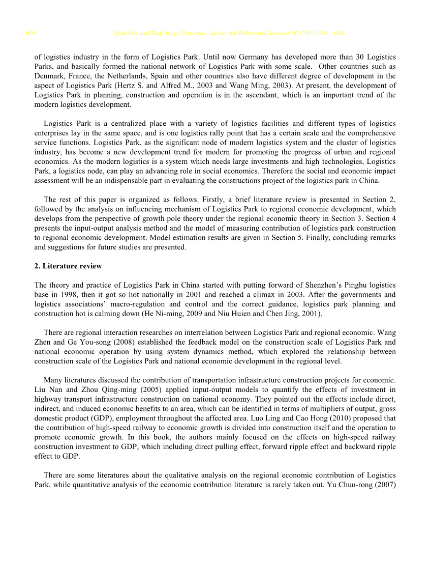 本文的其余部分安排如下。首先对第二部分进行简要的文献回顾,接着分析物流园区对区域经济发展的影响机制,并从第三节区域经济理论下的增长极理论的角度进行分析。第四部分介绍投入物流园区建设对区域经济发展的贡献度量模型。模型估计结果在第五节中给出。最后得出结论并对未来的研究方向提出建议。