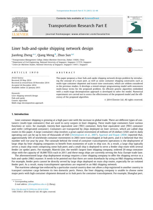 本文的贡献有三方面。首先,提出了一个班轮轴辐式航运网络设计问题。其次,针对该问题建立了非凸多线性项的混合整数规划模型。第三,提出了一种基于多阶段分解的遗传算法求解该模型。