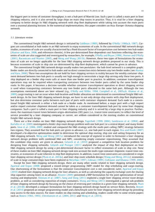 关于班轮轴辐式航运网络设计的研究较少。Fagerholt(1999, 2004)、Sambracos等(2004)和Karlaftis等(2009)研究了具有一个枢纽港(或一个中心仓库)和多个支线港口的支线船舶航线设计问题。Imai等(2006,2009)研究并比较了轴辐式策略与两个区域之间的多端口调用(multi-port-call, MPC)策略:他们假设枢纽港是预先给定的,即每个地区有一个枢纽港。Hsu和Hsieh (2007)开发了一种双目标优化模型来确定最优航线、船舶大小和频率的轴辐式运输网络。Meng和Wang (2011a)引入分段的概念,假定候选航线是预先给定的,提出了考虑空集装箱重新定位的轴辐式与MPC相结合的班轮运输网络设计问题。Gelareh等(2010)提出了一个设计班轮运输网络的竞争枢纽选址问题。Gelareh和Pisinger(2011)利用预先确定的折扣因子来反映船舶规模经济,分析了船队部署对班轮轴辐式航运网络设计的影响。这些关于班轮轴辐式航运网络设计的研究都没有考虑到多类型集装箱运输、运输时间限制或船队部署固有的规模经济。此外,单班轮运输服务设计(Plum等, 2014a)和班轮航线计划设计(Wang和Meng,2012a)考虑了运输时间约束;大型集装箱船的规模经济已经在McLellan(1997)、Gilman(1999)、Cullinane和Khanna(1999, 2000)中得到了探索。