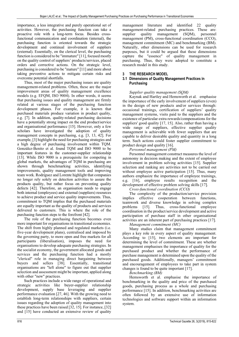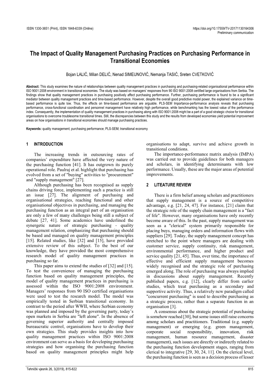 本文旨在扩展[32]和[15]的研究。为了测试基于质量管理原则管理采购职能的便利性,在ISO 9001: 2008环境中评估采购中的质量管理实践模型。来自90个ISO认证组织的管理人员的反馈用于测试研究模型。该模型在塞尔维亚过渡经济中进行了经验检验。与第二次世界大战后塞尔维亚执政党计划和实行的时 期相比,当今塞尔维亚的公开市场是“独处”的。在缺乏 上级管理权力和中央施加官僚控制的情况下,组织必须制定自己的战略。这项研究提供了关于如何在ISO 9001:2008环境中进行质量管理实践作为制定采购策略的基础以及如何基于质量管理原则组织采购职能的见解。